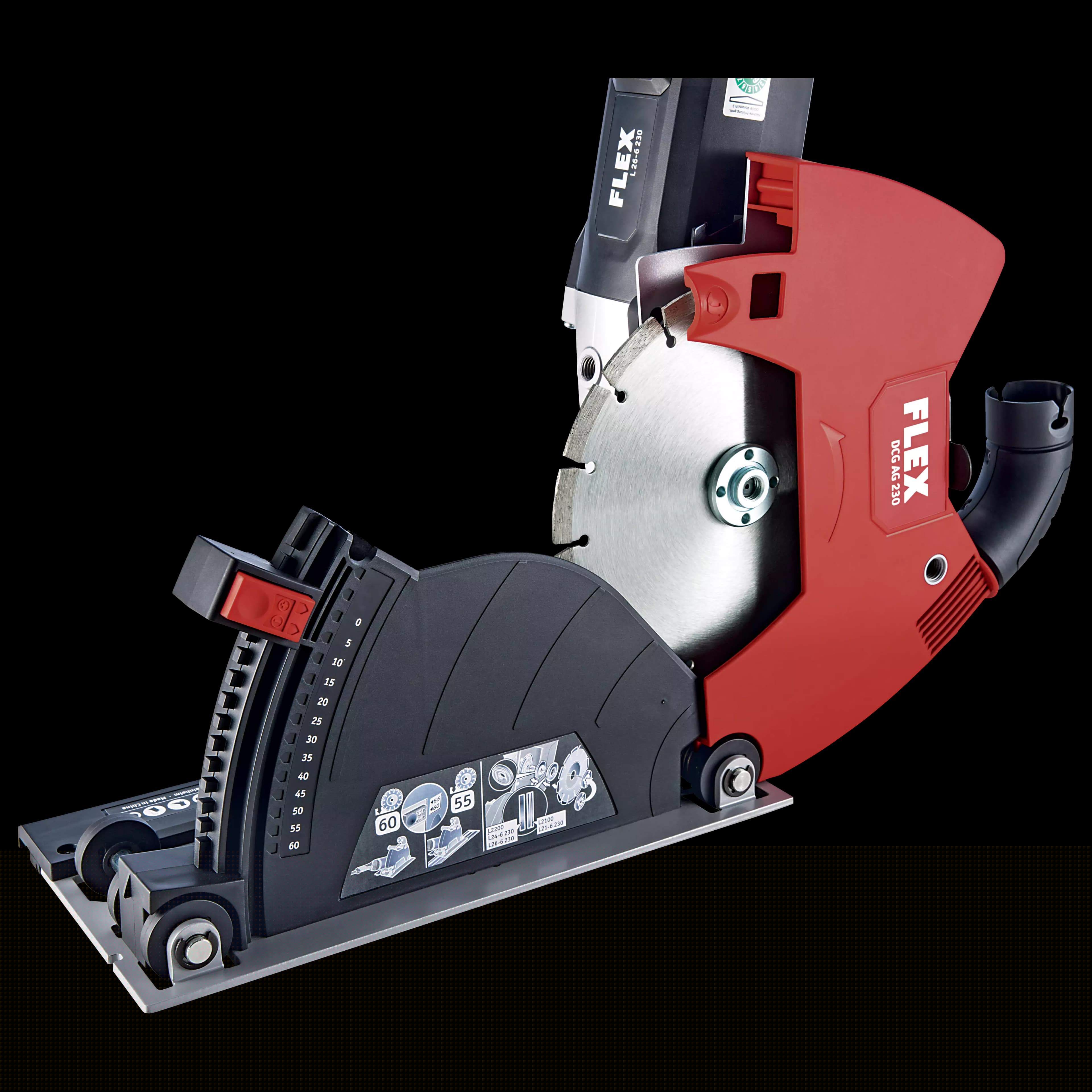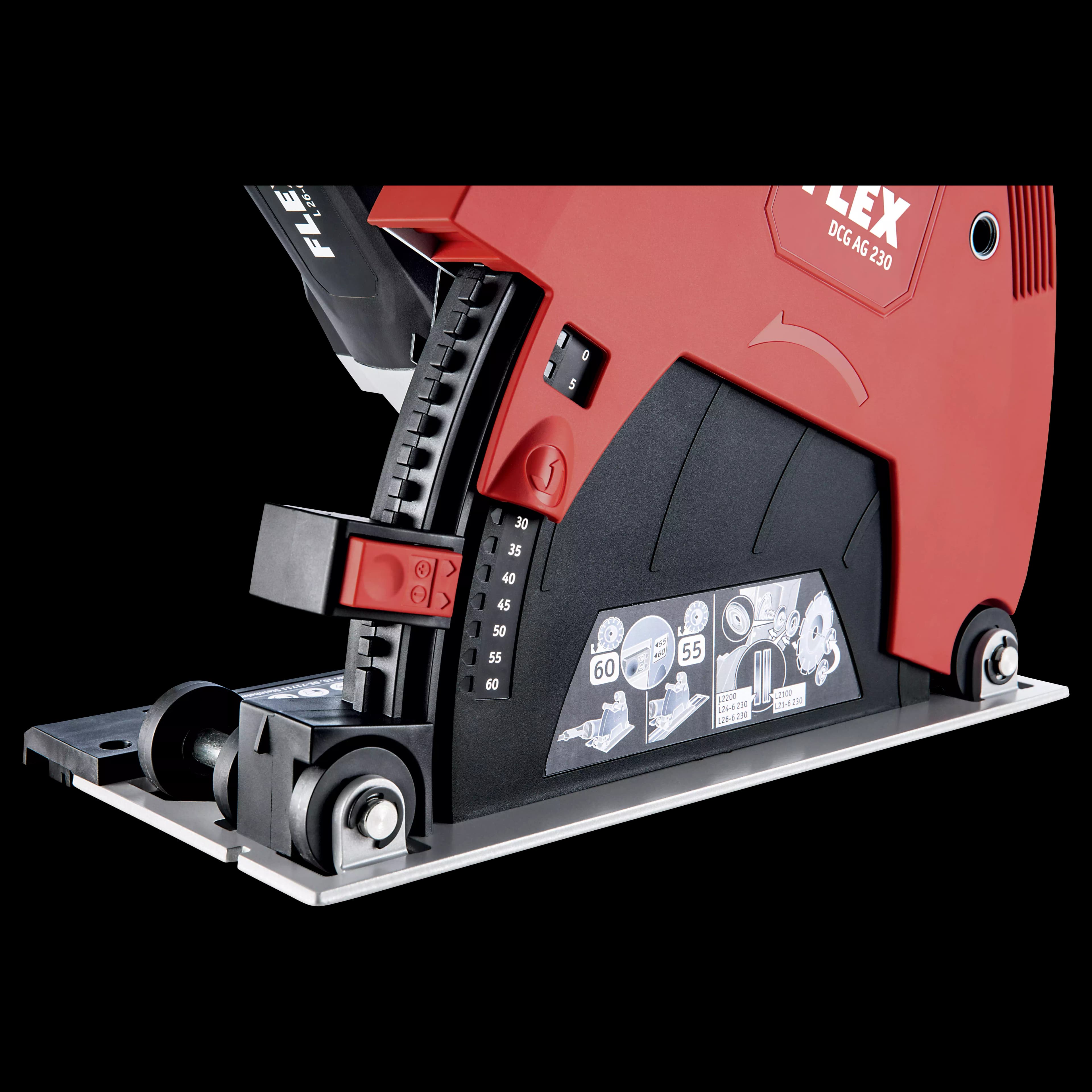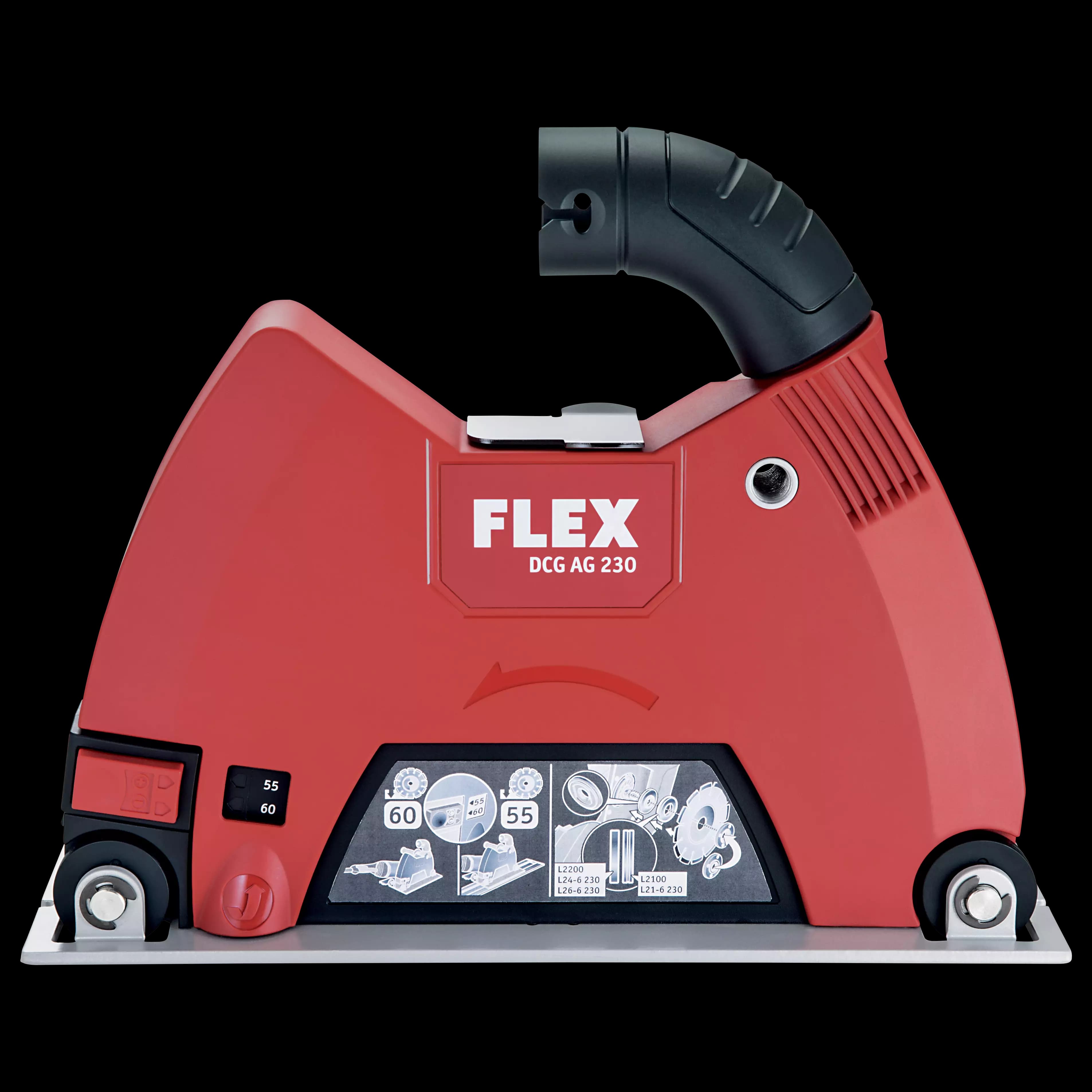 Trenn-Absaughaube mit effizienter Staubabsaugung für exakte Schnitte bei Arbeiten mit Diamant-Trennscheiben in Verbindung mit 230 mm Winkelschleifern. Extrem stabil, keine Verwindung durch das seitliche Gewicht des Winkelschleifers, dank Stabilisator-Element. Bodenplatte mit Rollen für einen einfachen Vorschub, Seitenhandgriff wahlweise links oder rechts montierbar. Inkl. Sauganschluss für FLEX Clip-System und Adapter für Führungsschiene. Tiefenanschlag mit Skala zur Voreinstellung der Schnitttiefe für die Verwendung mit oder ohne Führungsschiene. Maximale Schnitt-Tiefe 60 mm.