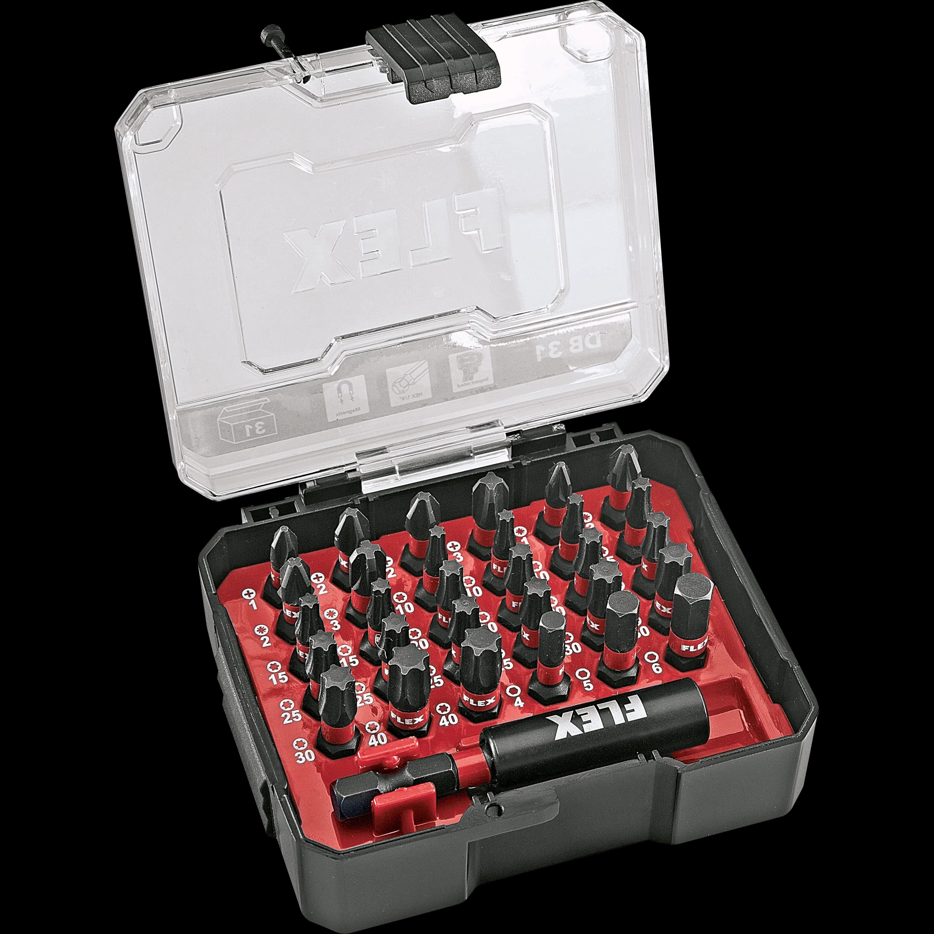 Customised bit set for many applications, very robust and impact-resistant with 1/4 inch external hexagonal shank. For drill drivers, hammer drill drivers, impact wrenches and screwdrivers. The special torsion zone ensures extreme durability under continuous load. The clear labelling in the box indicates which bits are included in the set. Box suitable for the STACK PACK system, stackable. Contents: 1" (25 mm) PH1, 2x PH2, PH3, PZ1, 2x PZ2, PZ3, H4, H5, H6, je 3x T10/T15, each 4x T20/T25, 3x T30, 2x T40 and 60 mm universal bit holder, impact-resistant, magnetic.