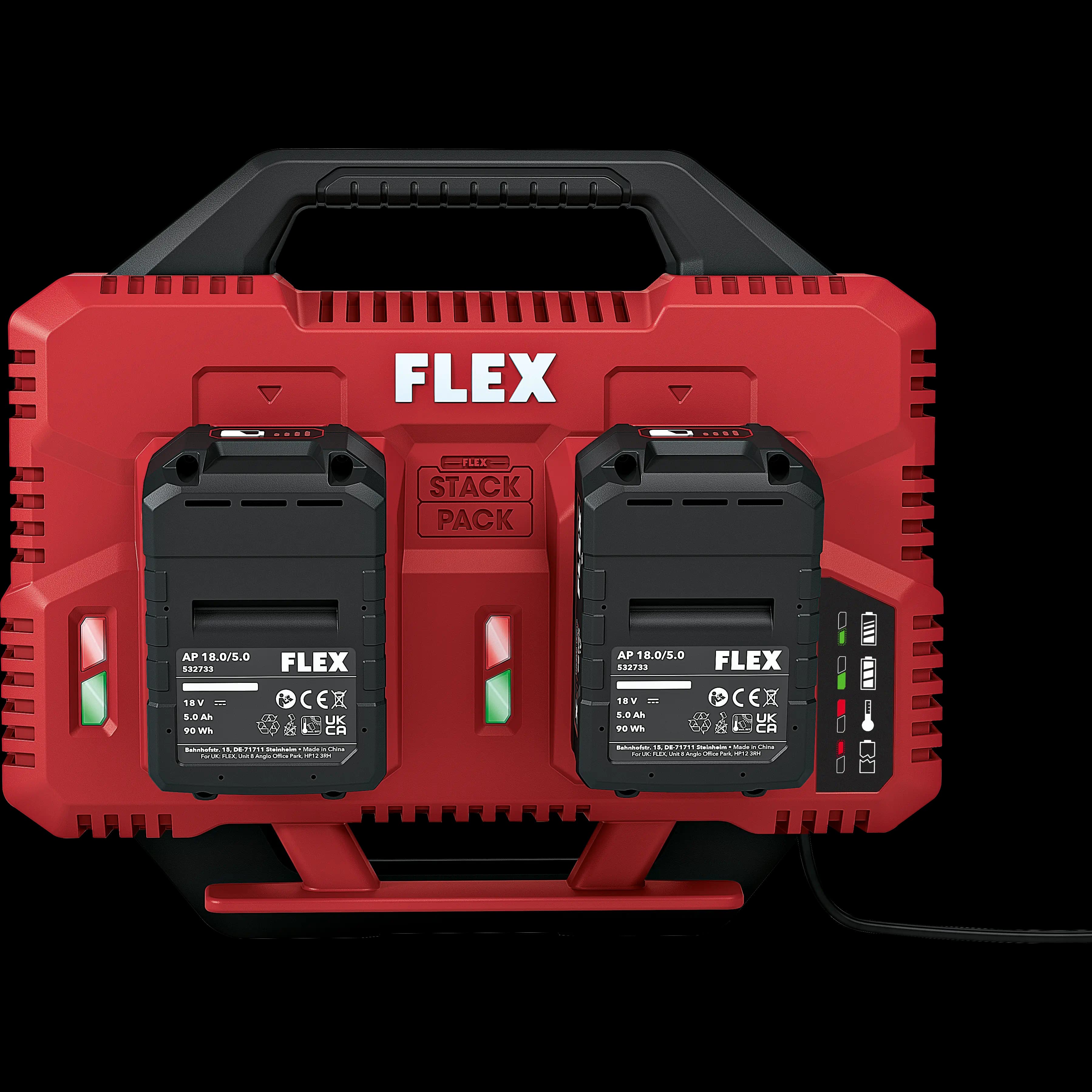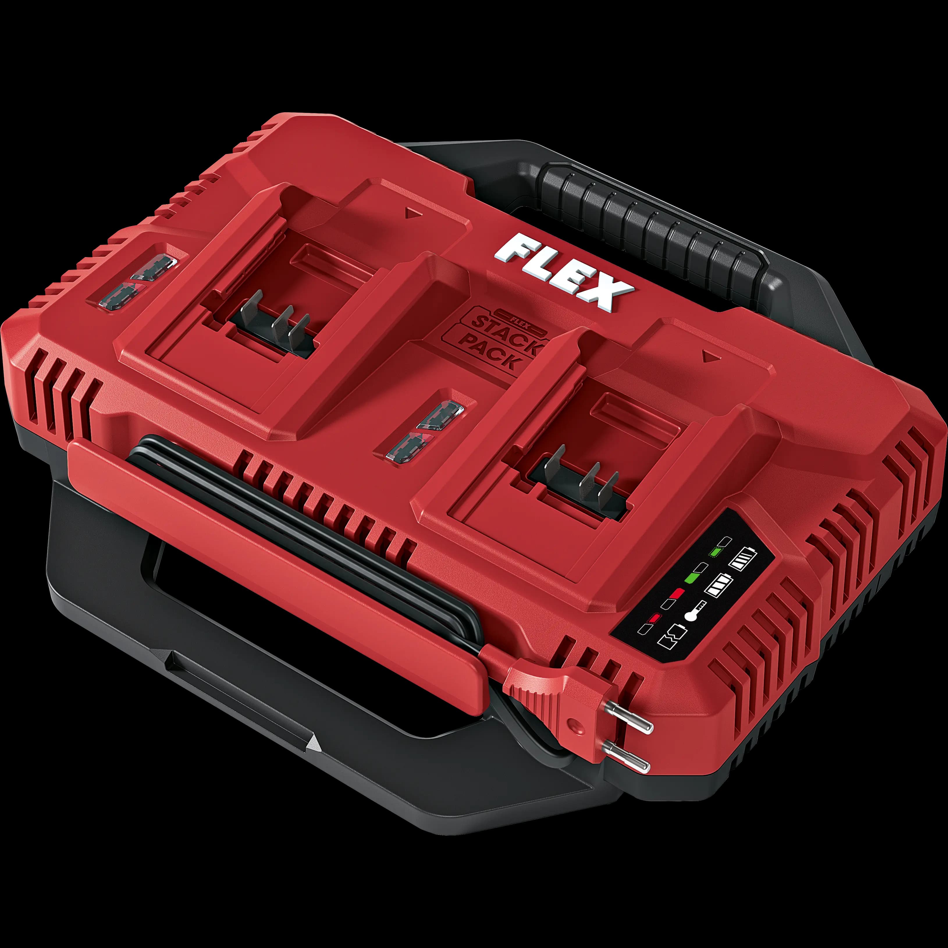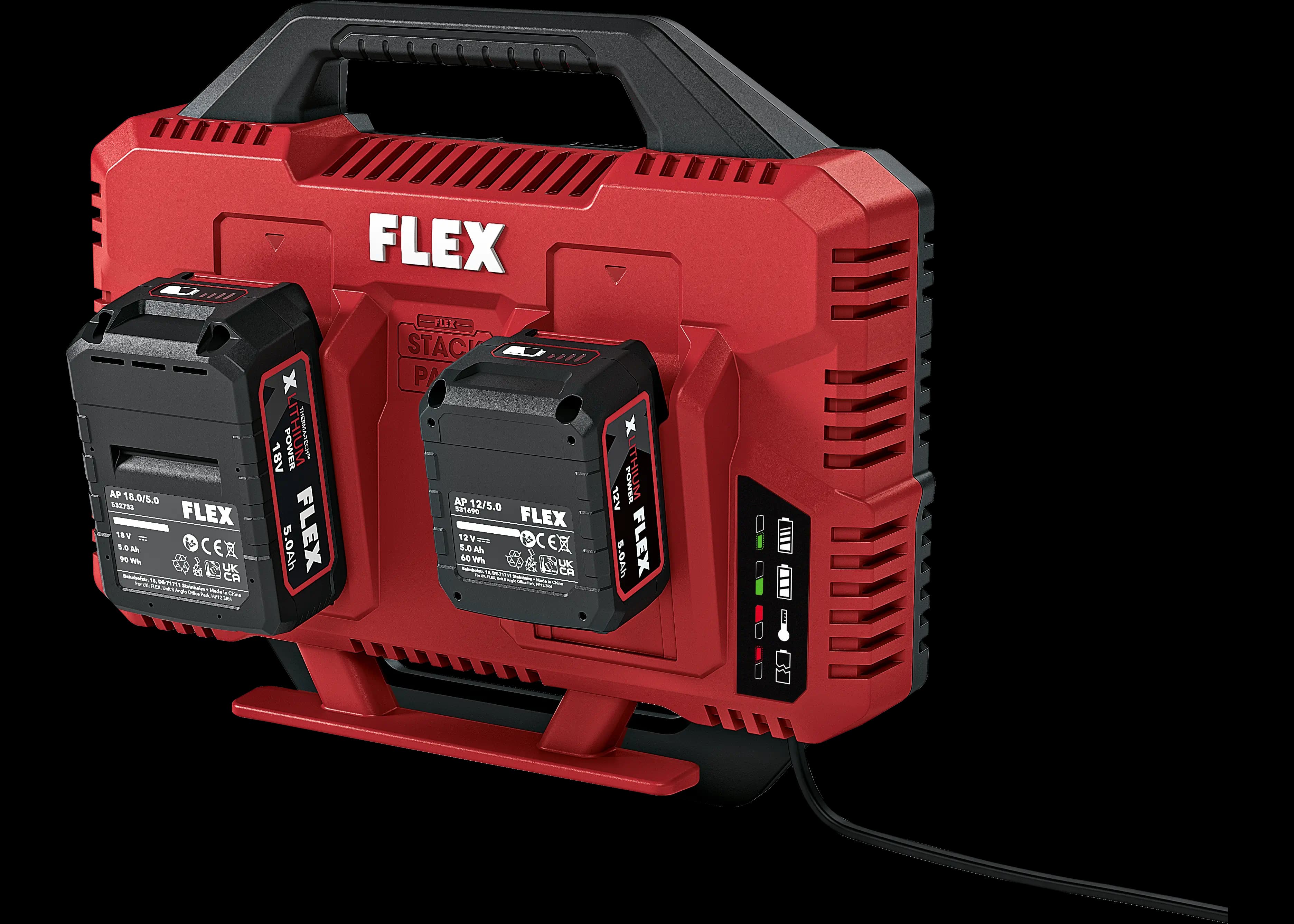 Il caricatore rapido ha spazio per due batterie. 2 x 150 W assicurano una carica rapida e simultanea delle batterie da 12 e 18 V. Con indicatore di stato di carica a LED, raffreddamento integrato del pacco batteria, protezione da surriscaldamento, scarica e sovraccarico. L'avvolgicavo sull'alloggiamento e il dispositivo per il montaggio a parete mantengono l'ordine. Il caricatore rapido è compatibile con il sistema di stoccaggio e trasporto FLEX STACK PACK e può essere montato sul coperchio dei box/organizer. Tempo di ricarica delle batterie da 18 V: 2,5 Ah / 40 min, 5,0 Ah / 60 min, 8,0 Ah / 95 min.