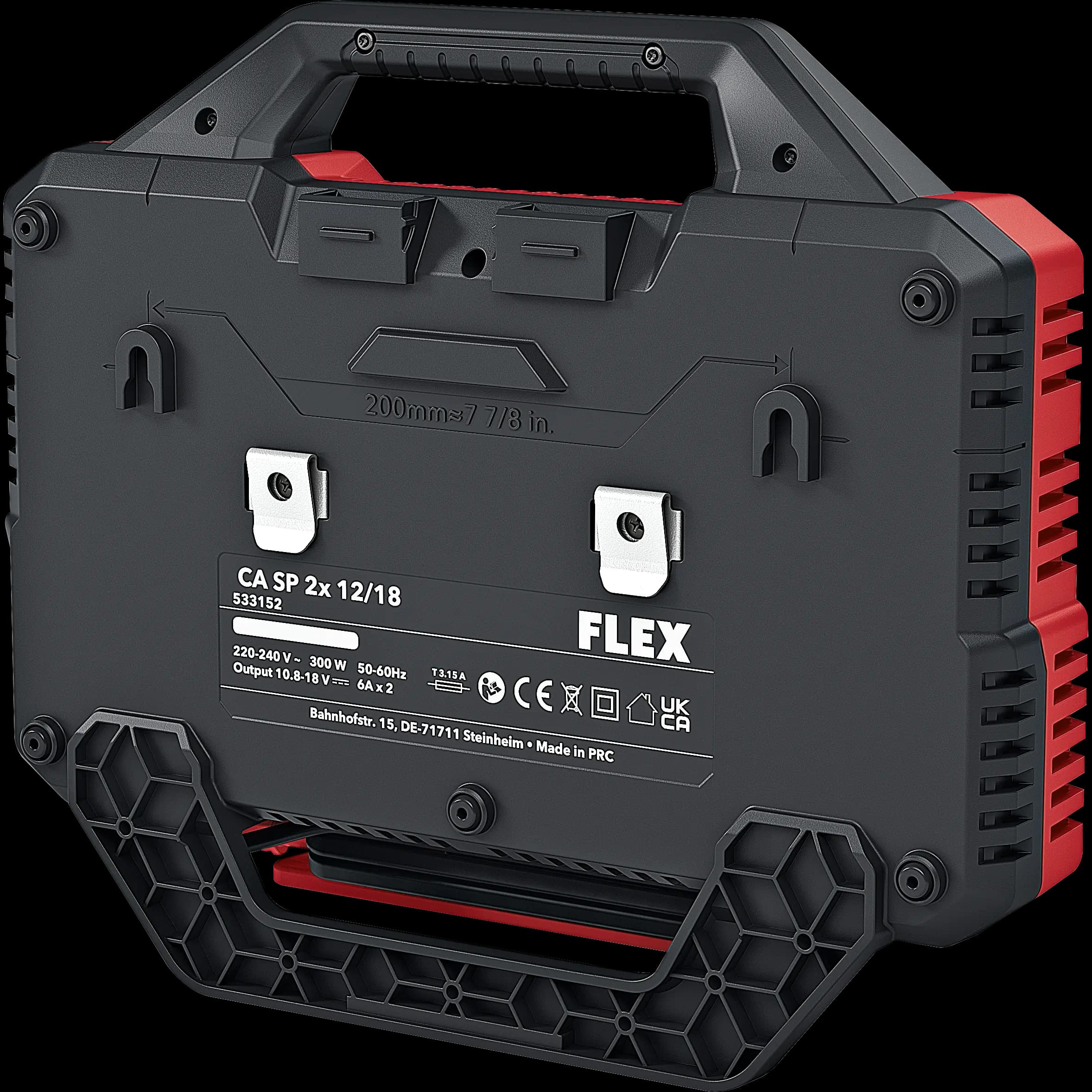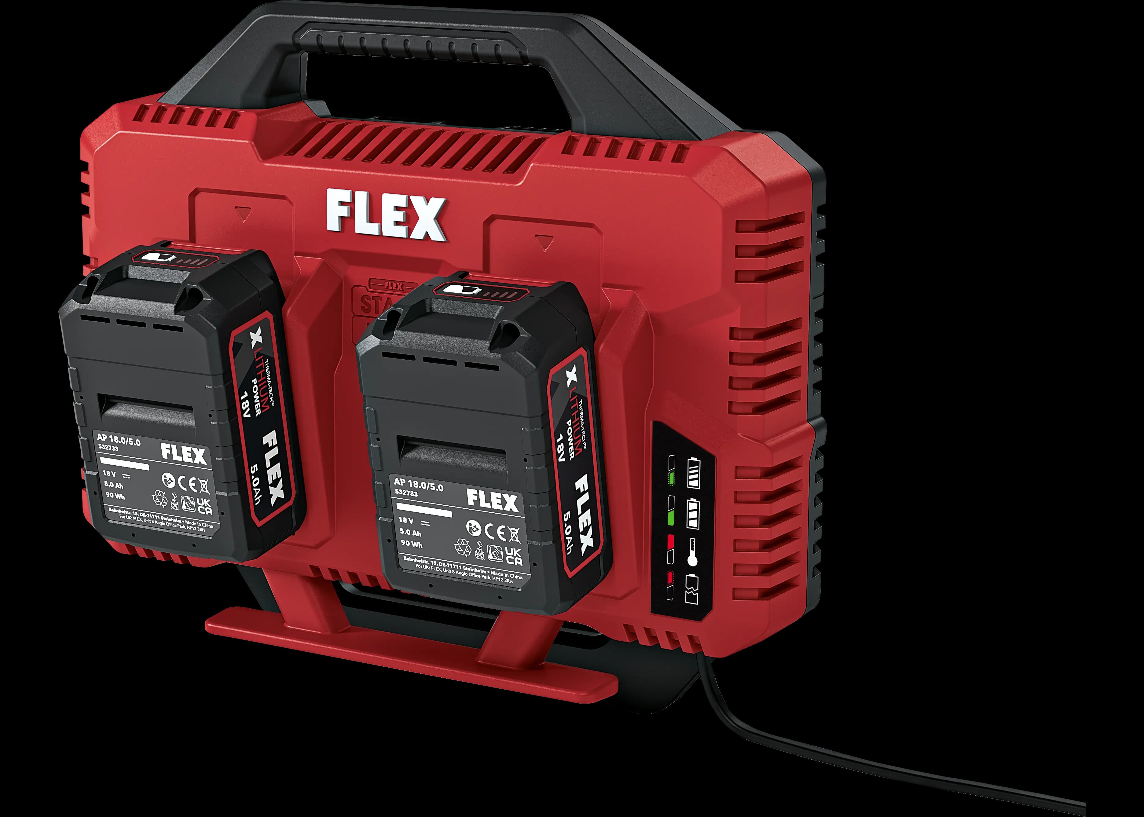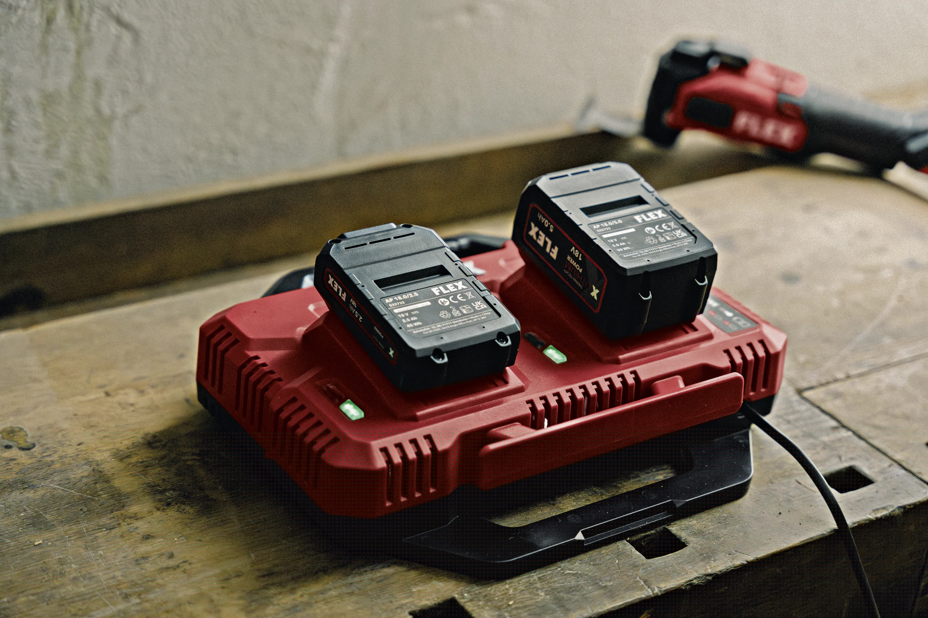 Il caricatore rapido ha spazio per due batterie. 2 x 150 W assicurano una carica rapida e simultanea delle batterie da 12 e 18 V. Con indicatore di stato di carica a LED, raffreddamento integrato del pacco batteria, protezione da surriscaldamento, scarica e sovraccarico. L'avvolgicavo sull'alloggiamento e il dispositivo per il montaggio a parete mantengono l'ordine. Il caricatore rapido è compatibile con il sistema di stoccaggio e trasporto FLEX STACK PACK e può essere montato sul coperchio dei box/organizer. Tempo di ricarica delle batterie da 18 V: 2,5 Ah / 40 min, 5,0 Ah / 60 min, 8,0 Ah / 95 min.
