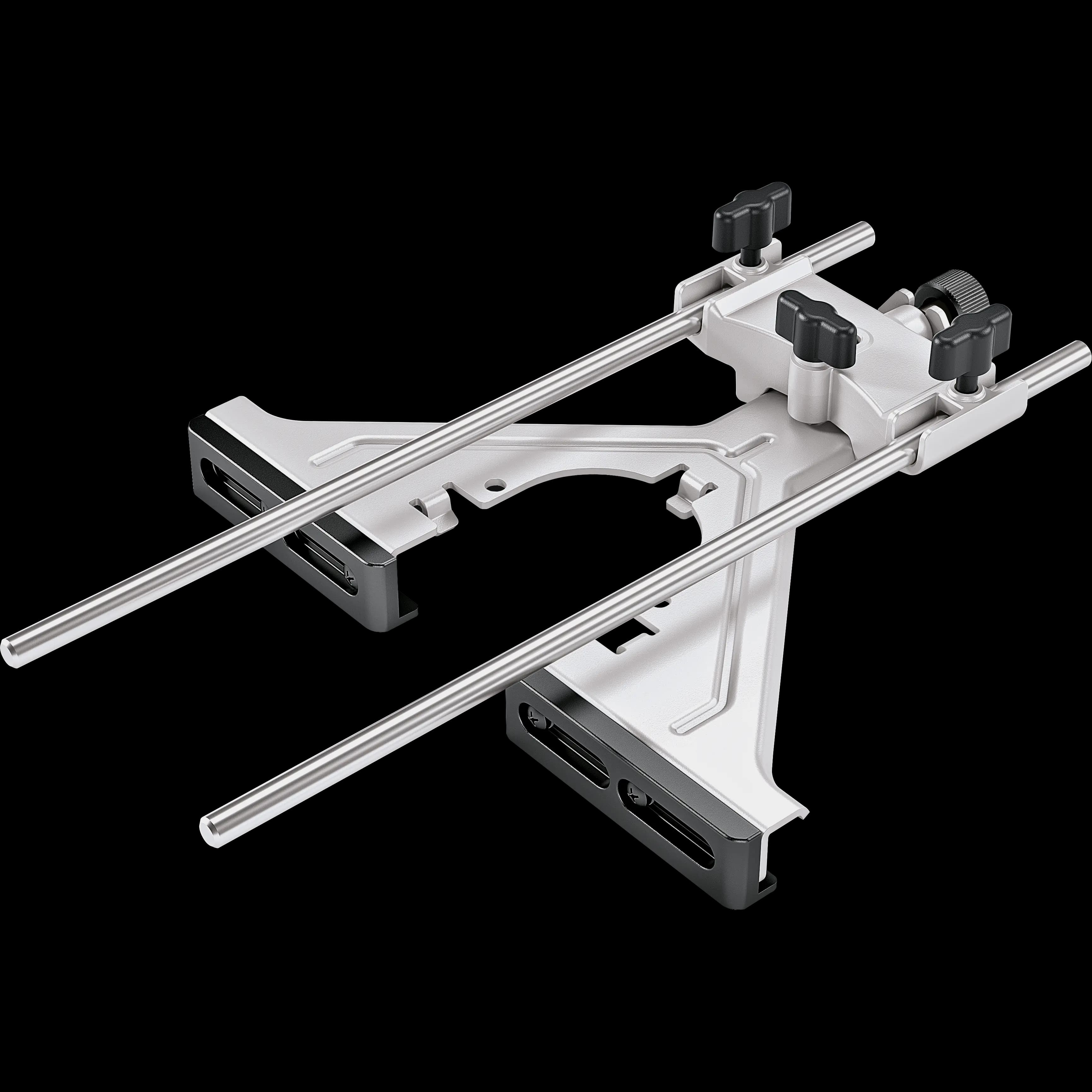 Parallelaanslag met twee geleidingsstangen voor een veilige geleiding van de bovenfrees langs de rand van het werkstuk.