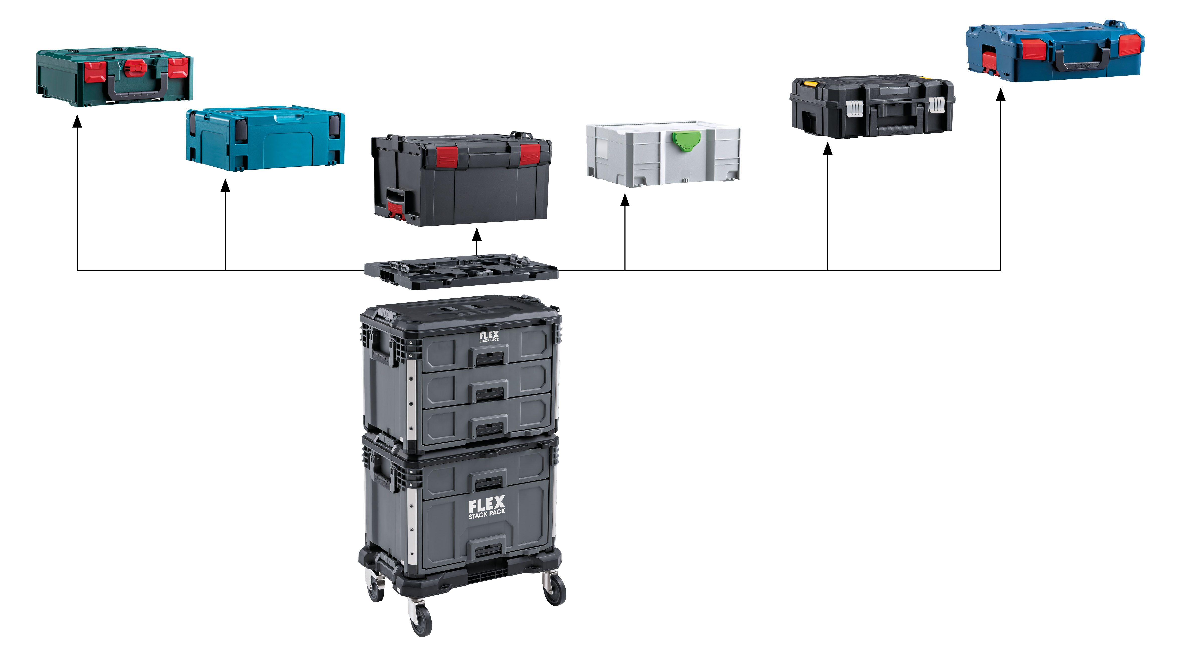 Das Prinzip ist ebenso simpel wie genial: mehrere Boxen, eine einzige Verbindung. Anwender, die bereits unterschiedliche Koffersysteme oder Elektrowerkzeuge im Einsatz haben, können diese jetzt ganz einfach mit dem FLEX STACK PACK verbinden – ohne Umräumen, ohne Kompromisse.