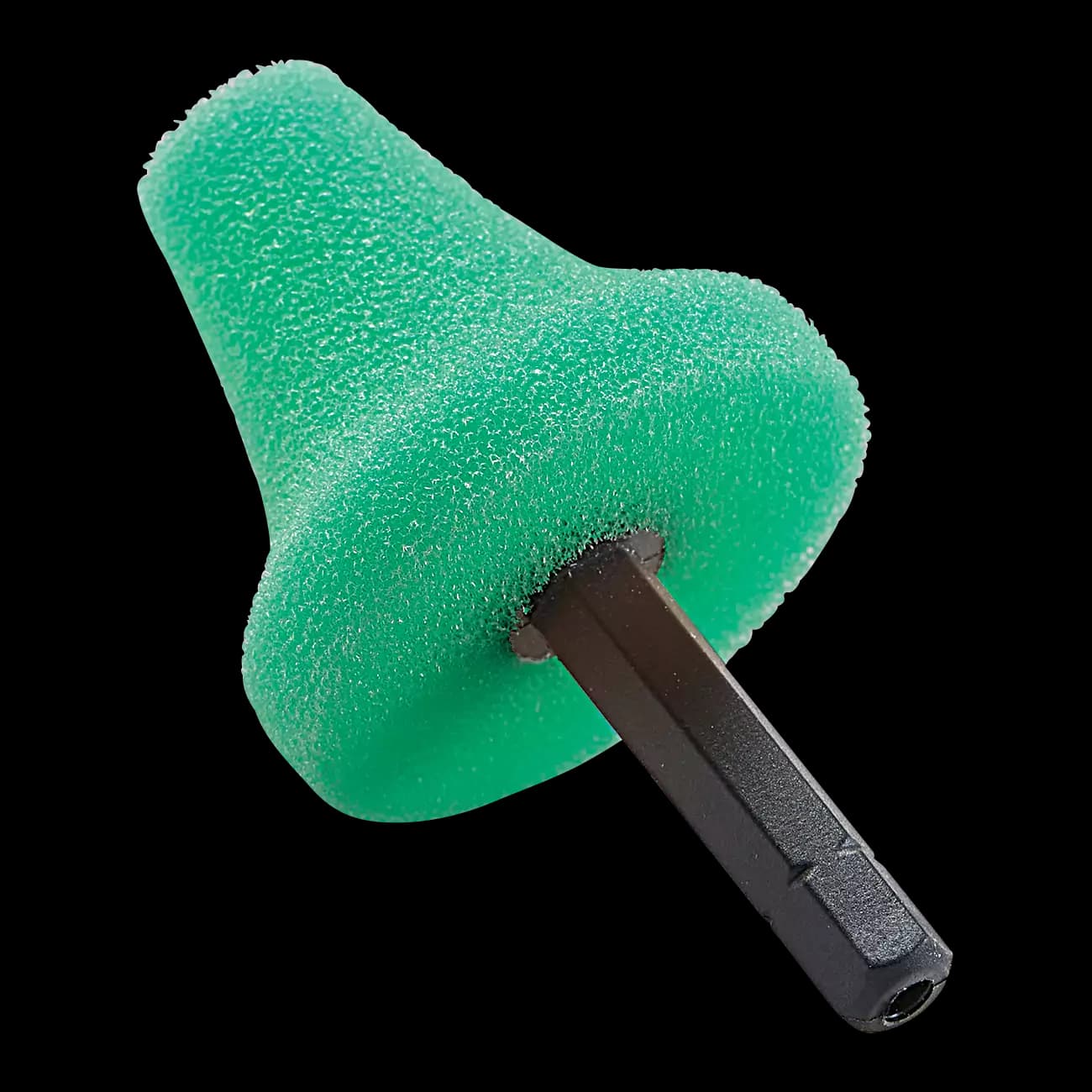 Green sponge with a hard foam texture for a high rate of removal and treating deeper scratches. Conical shape ideally suited for polishing door handle recesses, radiator grilles, rims and interiors. Rounded edges to avoid grinding marks and a practical tip for polishing in corners and edges. Tool-free changing thanks to hexagonal bit holder receptacle on the shaft. Can be used with the flexible shaft FS 140 in combination with the polishing machine PXE 80 10.8-EC.