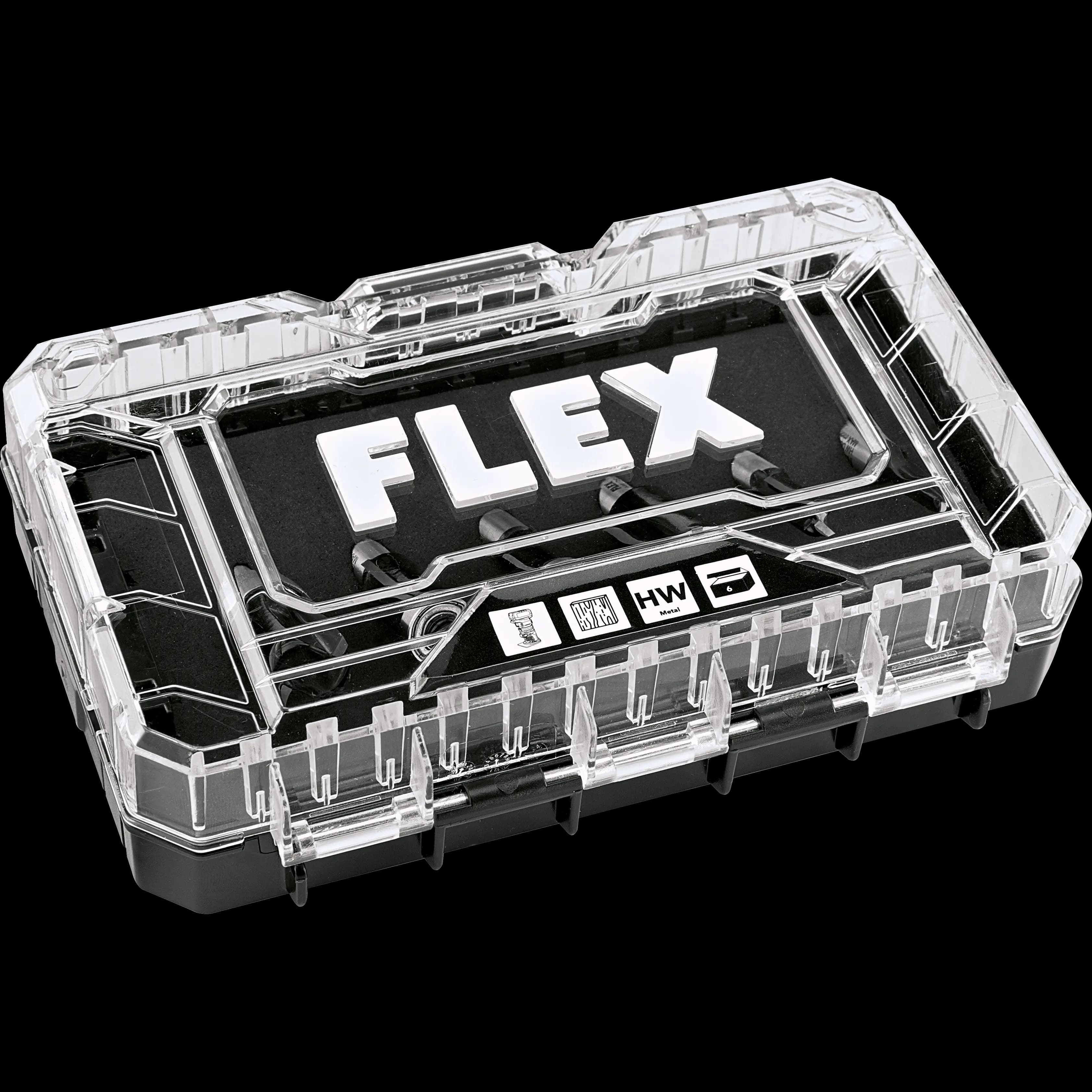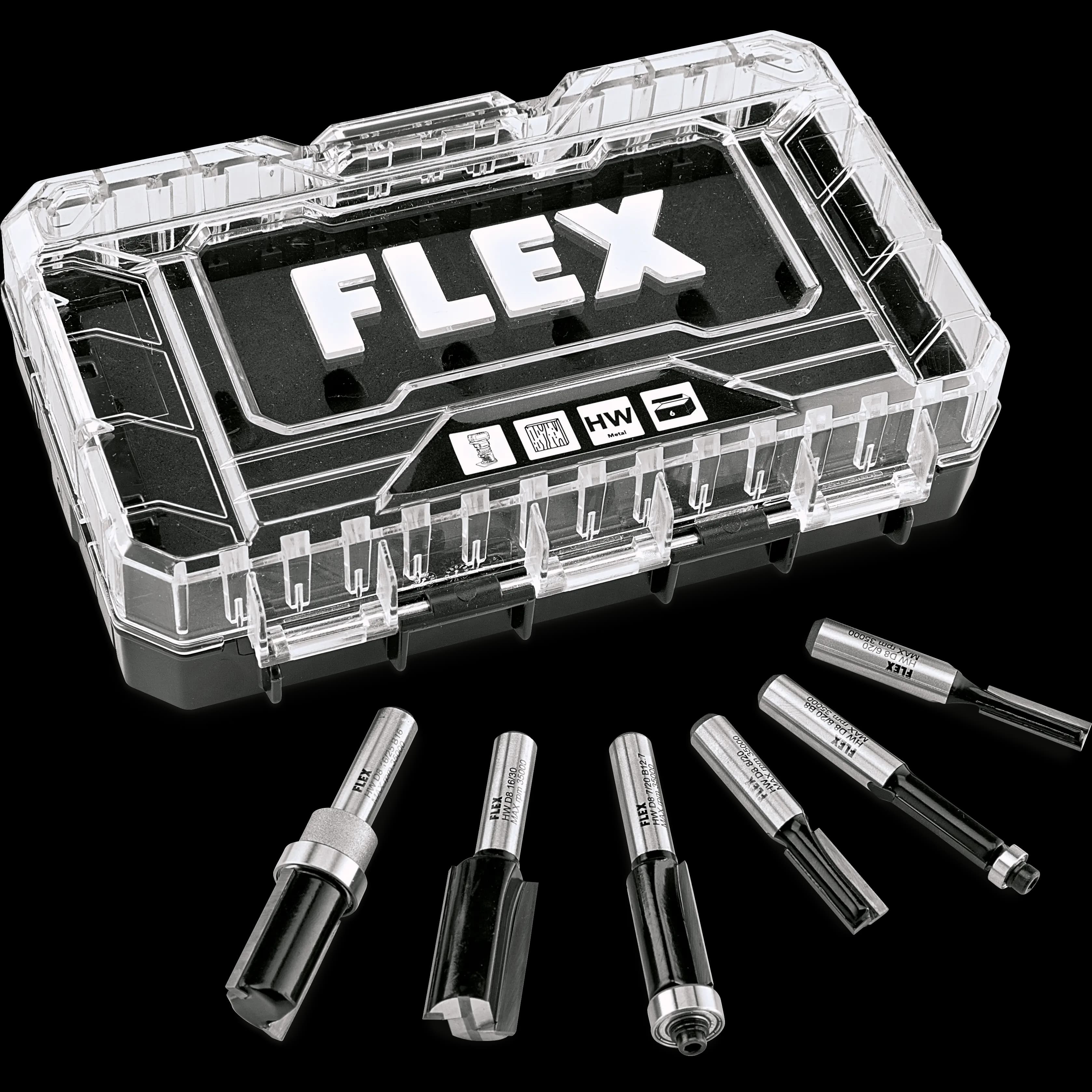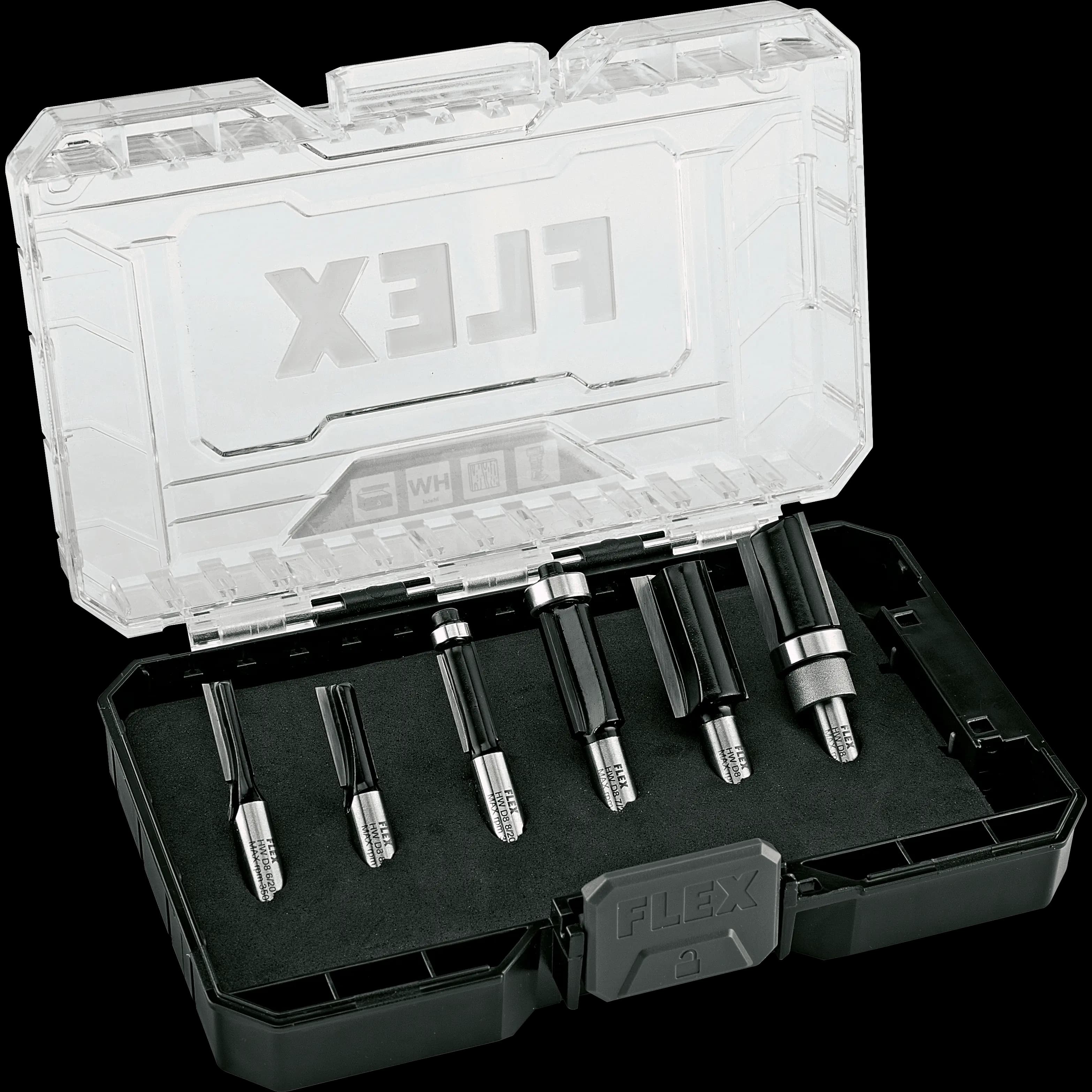 Edge cutter bit set with carbide cutting edges, packed in the practical Stack Pack bit box with sponge rubber insert. Consisting of 1x slot cutter D6x20 mm, slot cutter D8x20 mm, slot cutter D16x30 mm and 1x flush milling cutter D8x20 mm with thrust ball bearing D8, flush milling cutter D12.7x25 mm with thrust ball bearing D12.7, flush milling cutter D16x25 mm with thrust ball bearing, top D16.