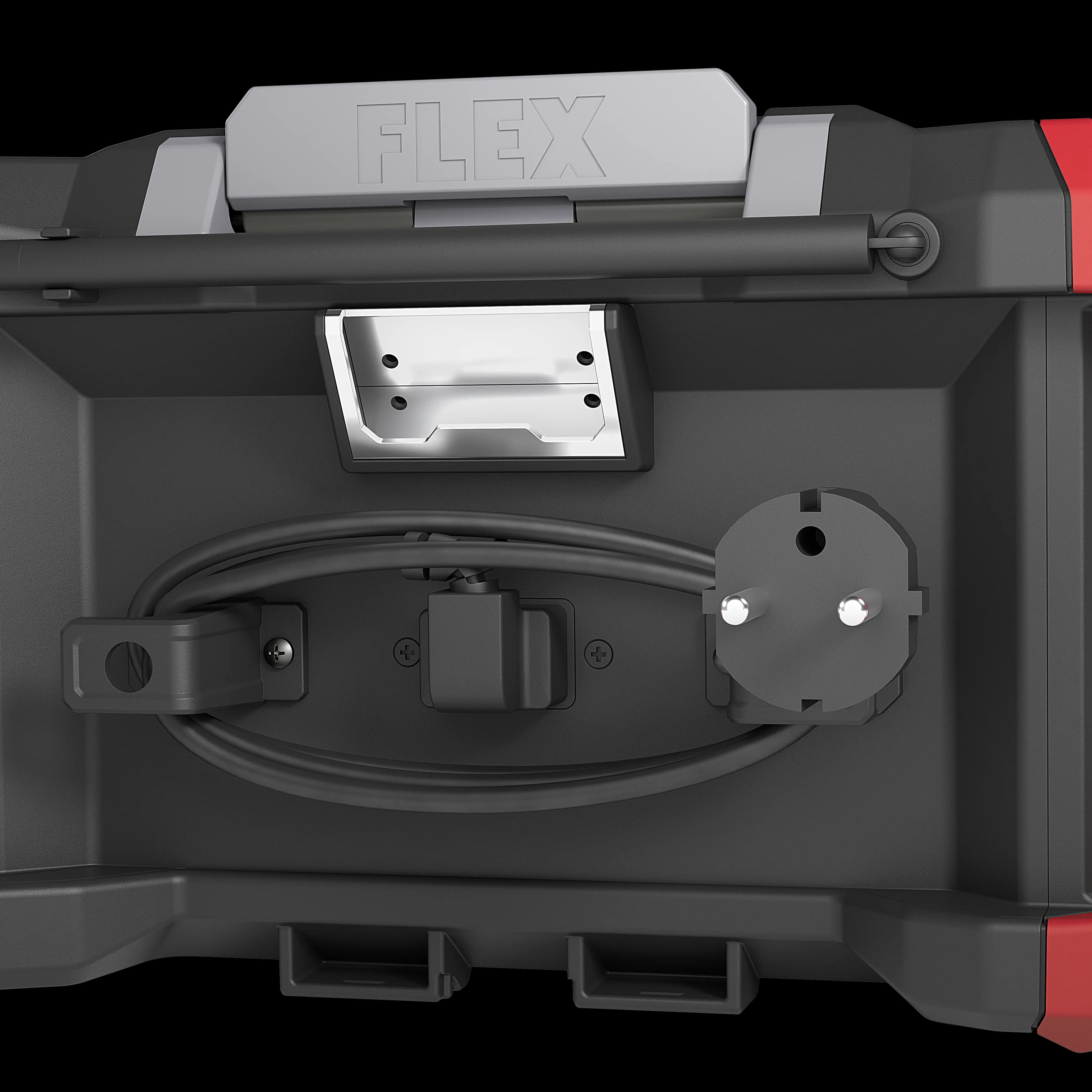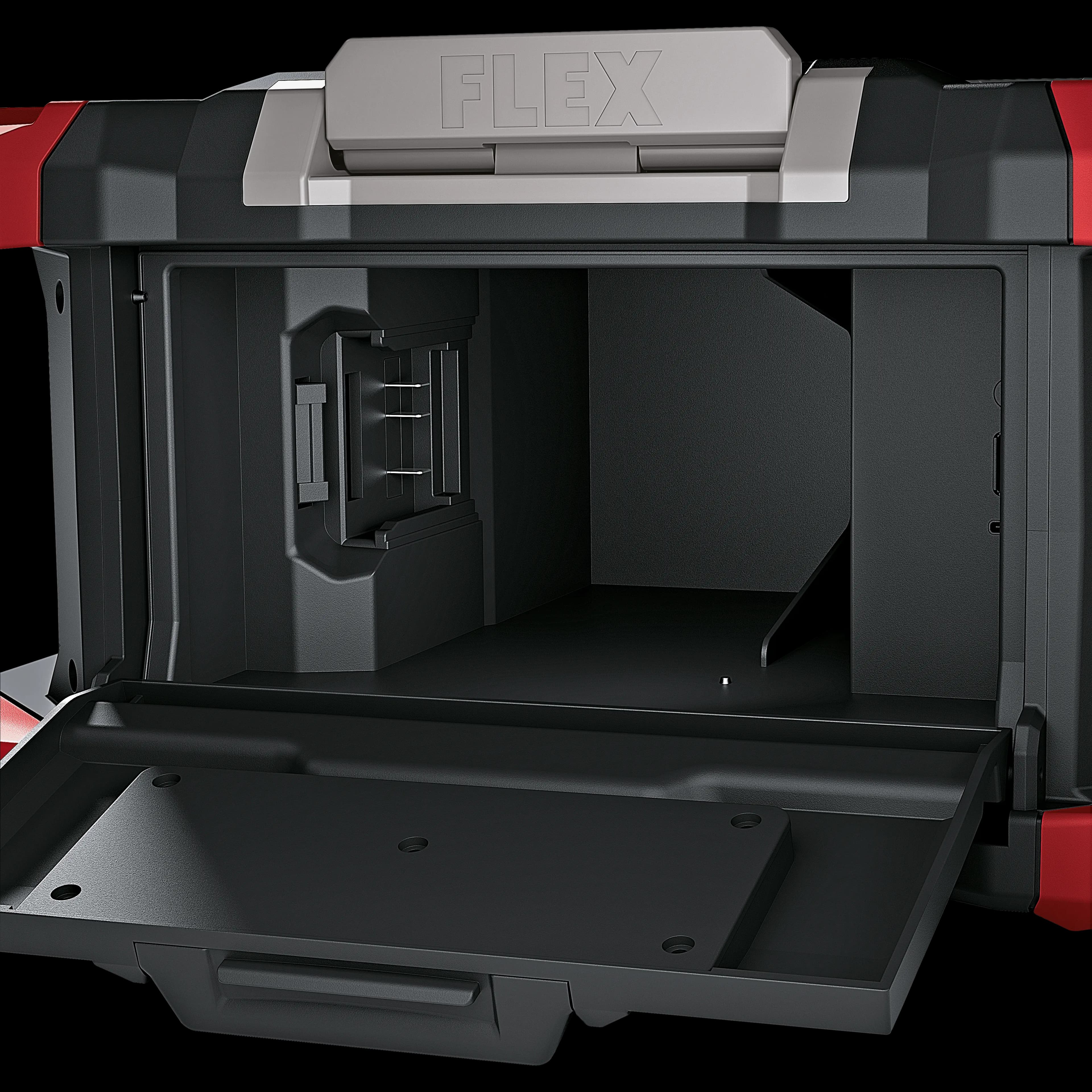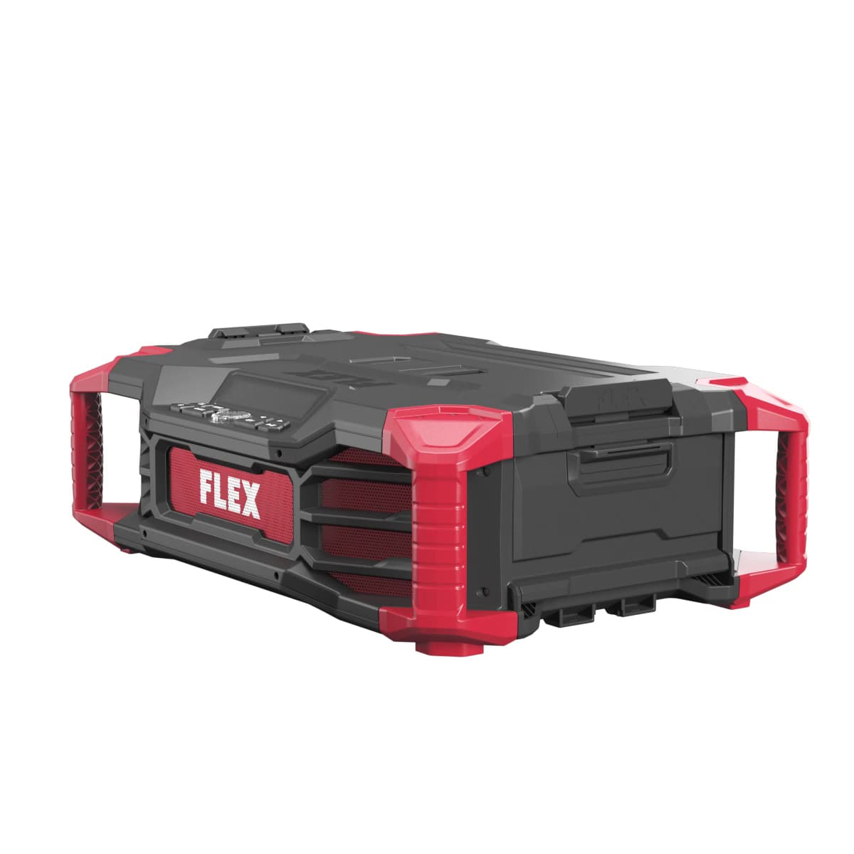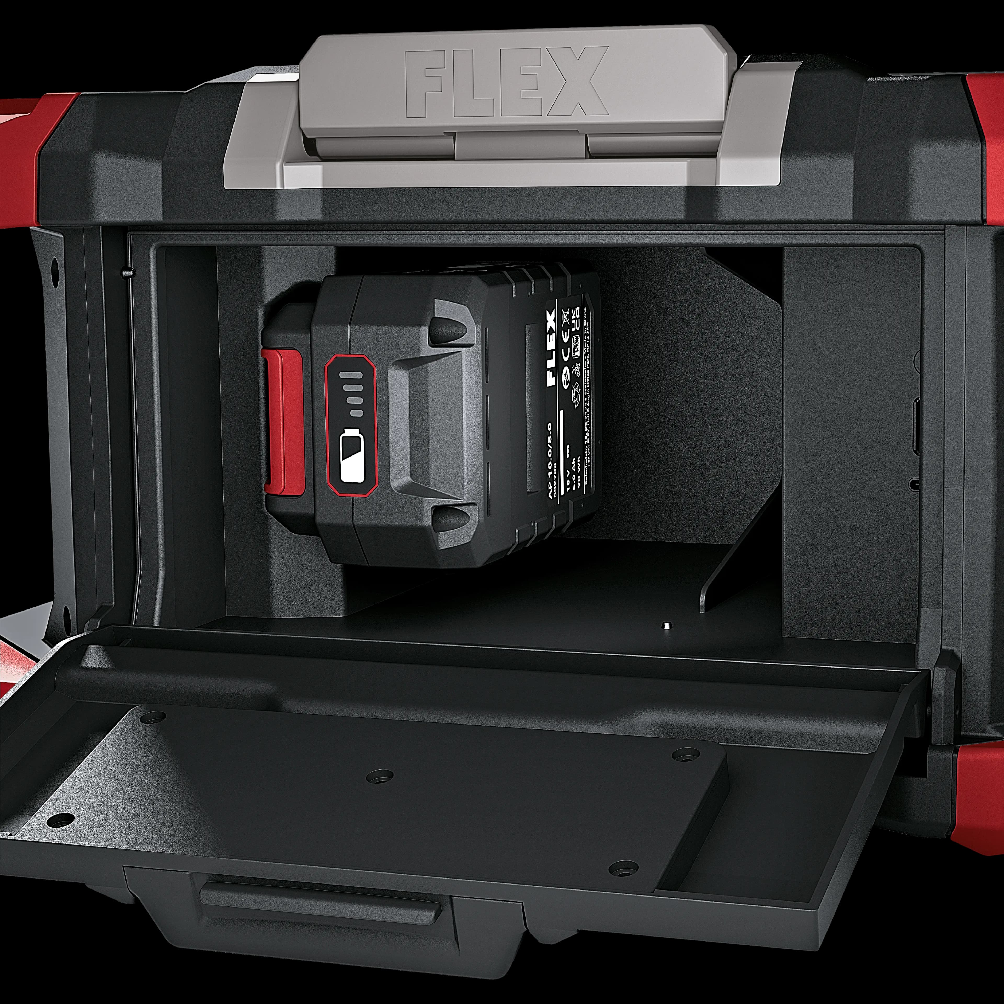 • The cordless construction site radio is compatible with the FLEX STACK PACK storage and transport system. This means it can be easily transported to the construction site with additional boxes for tools and accessories. Interlocking quick-connect fasteners allow fast, flexible and effortless component connection