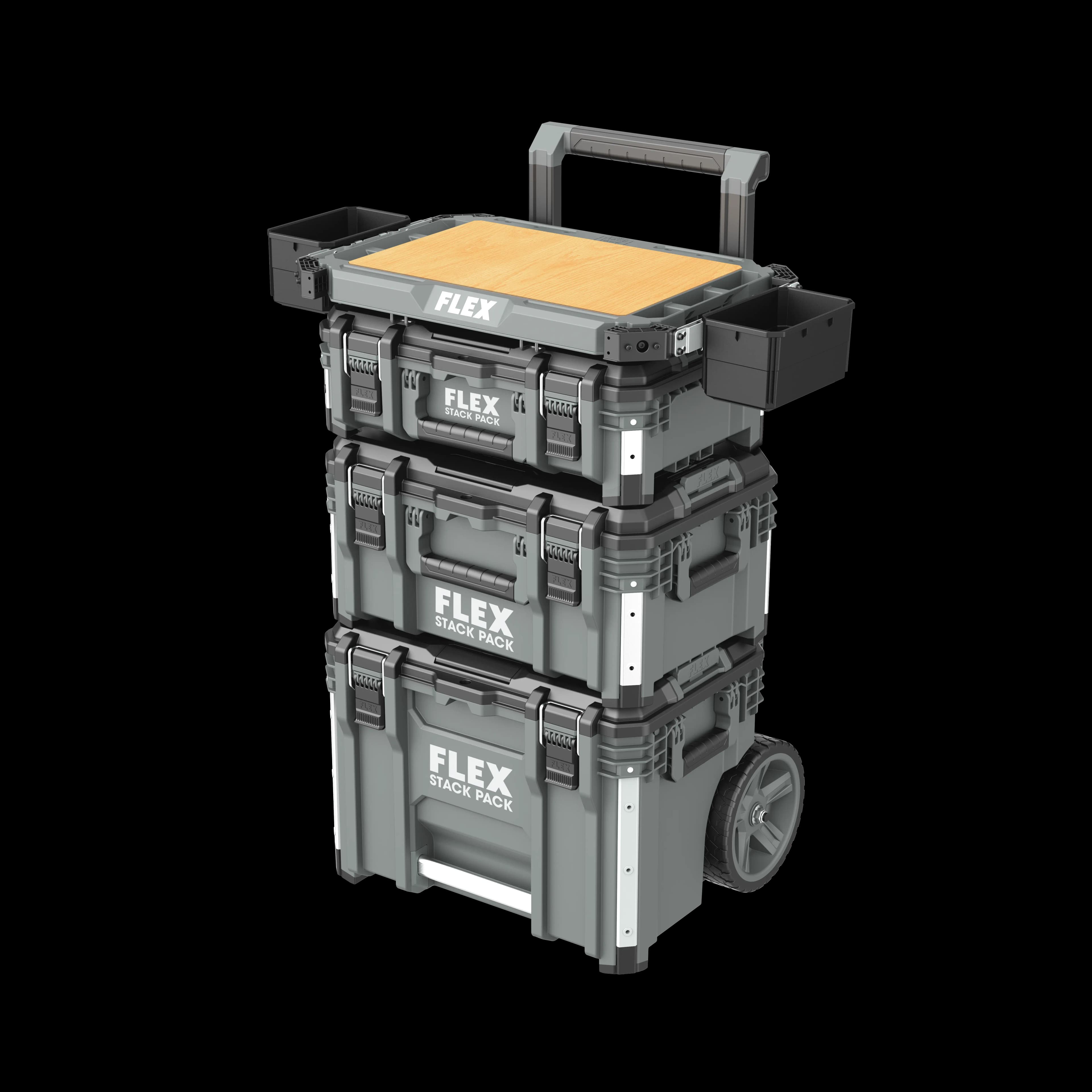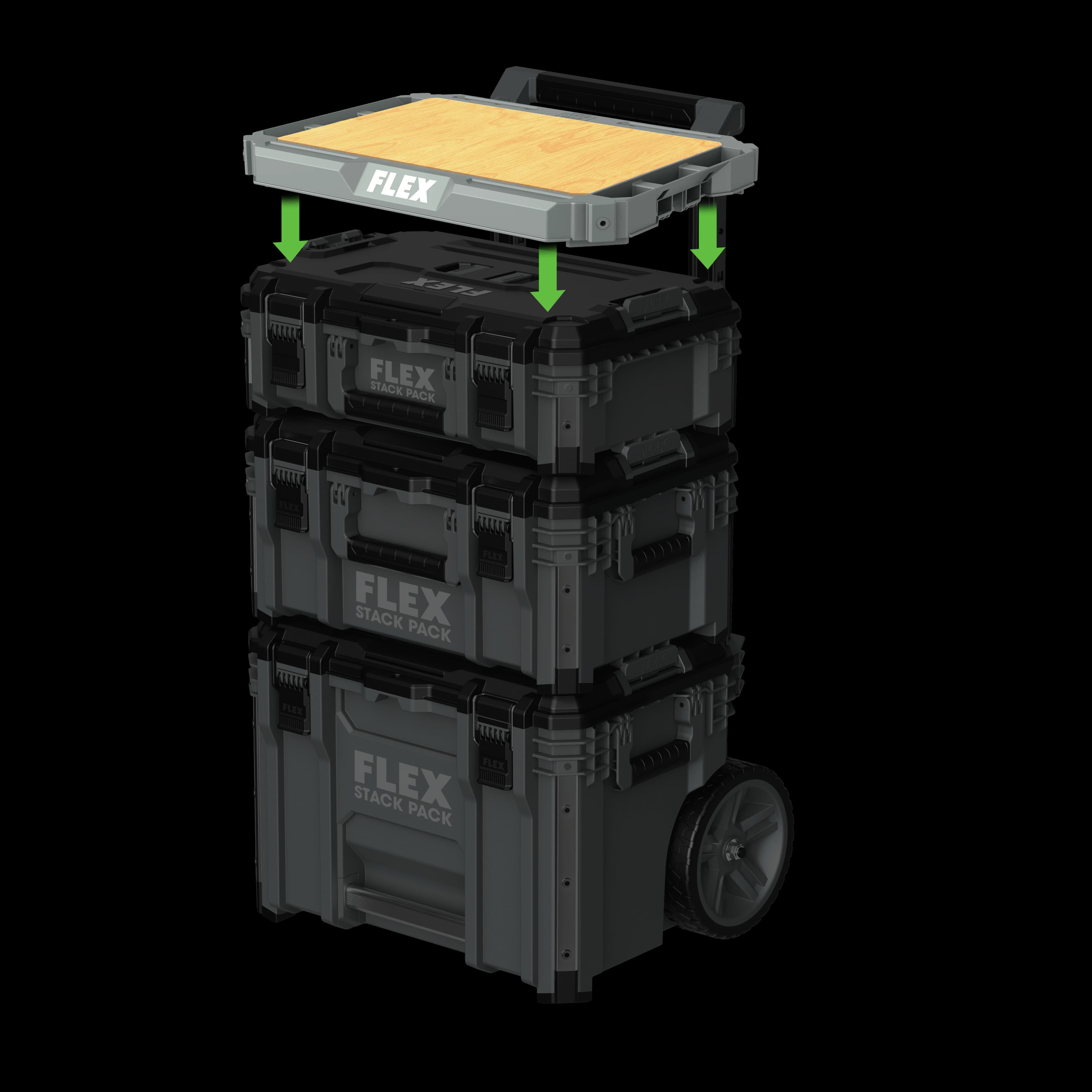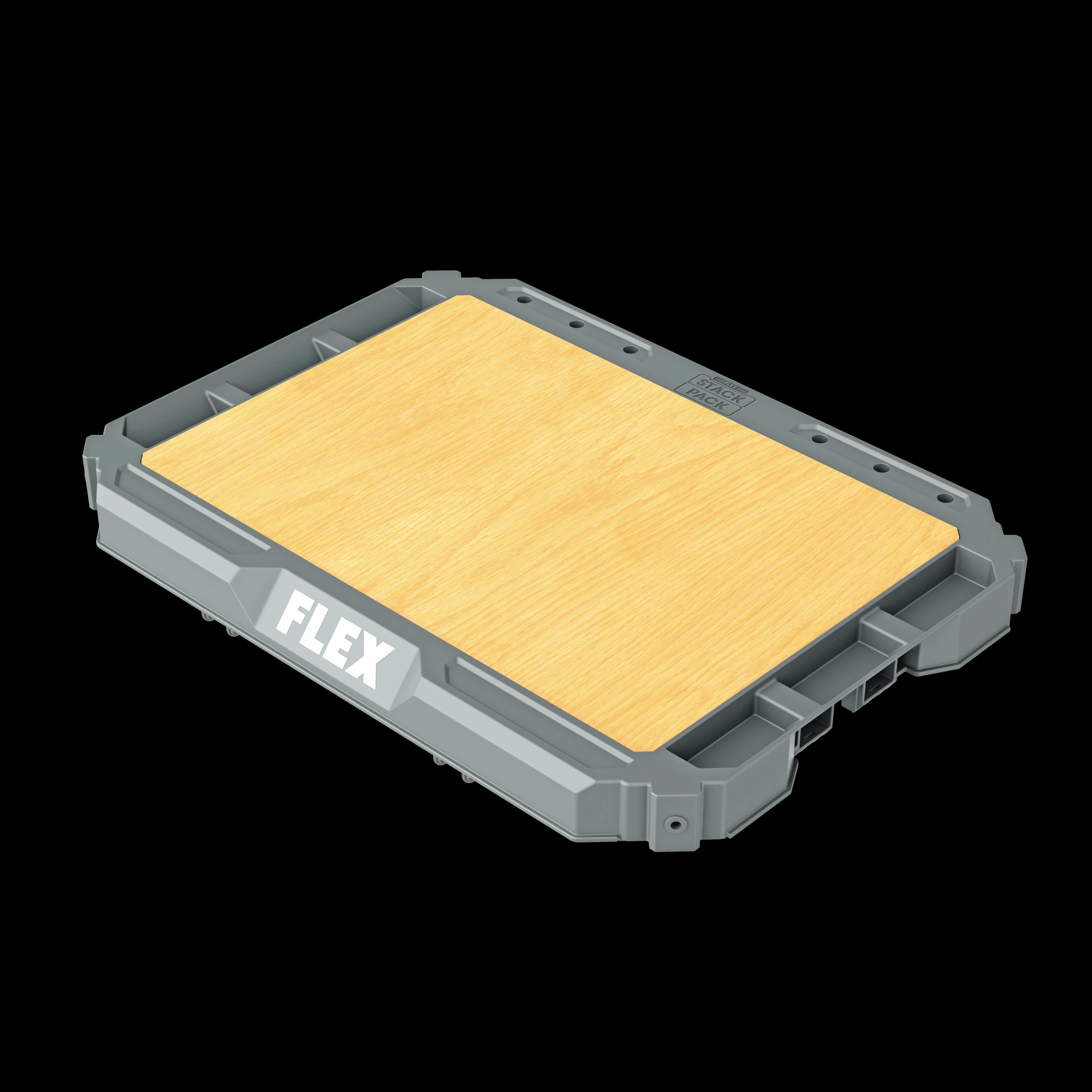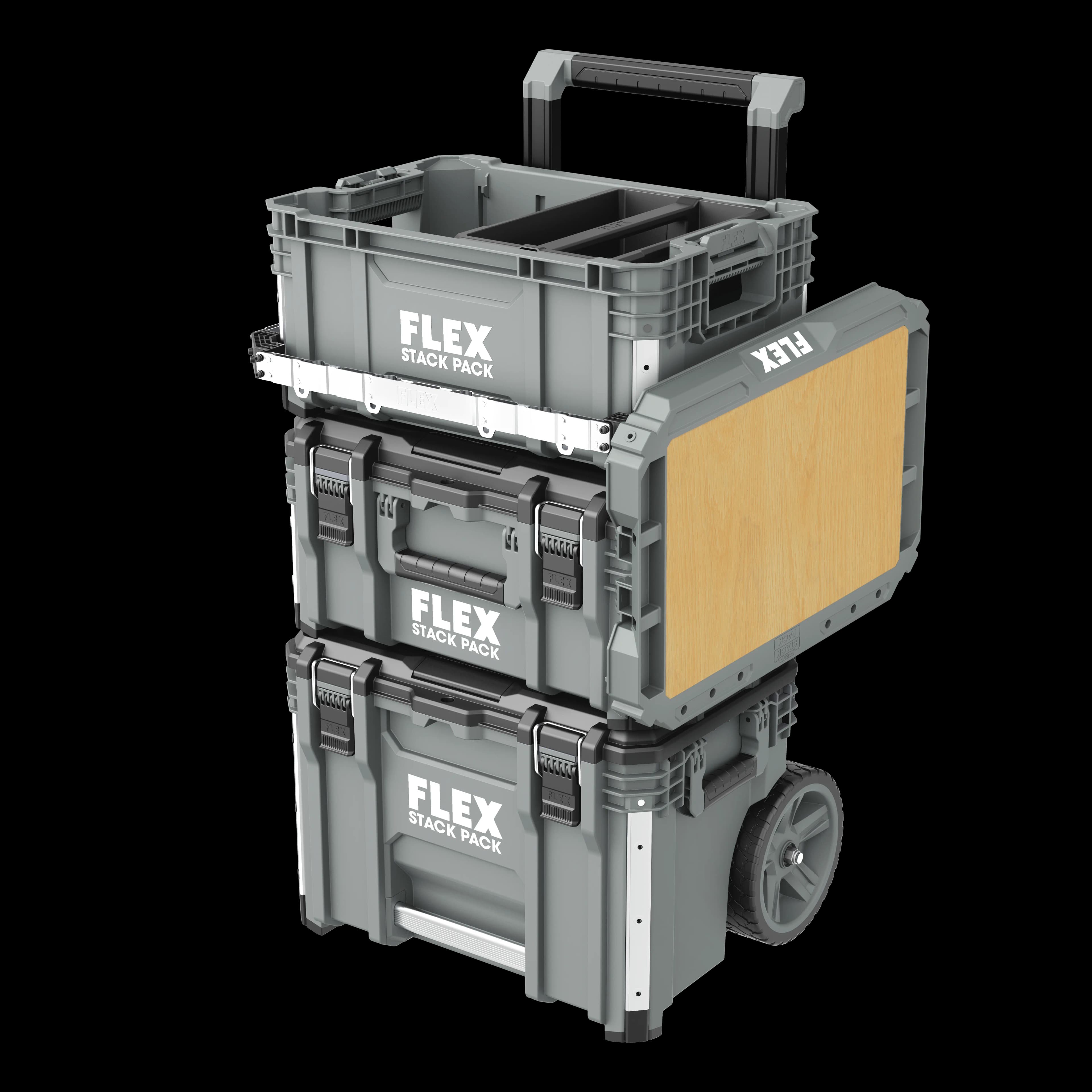 The worktop can be used to transform the STACK PACK system into a mobile work surface. It has a robust, renewable plywood panel that is easy to transport and can be taken straight to the construction site. The worktop can be easily attached to the lid of the boxes using interlocking quick-release fasteners. It also contains storage compartments and holders for tools.