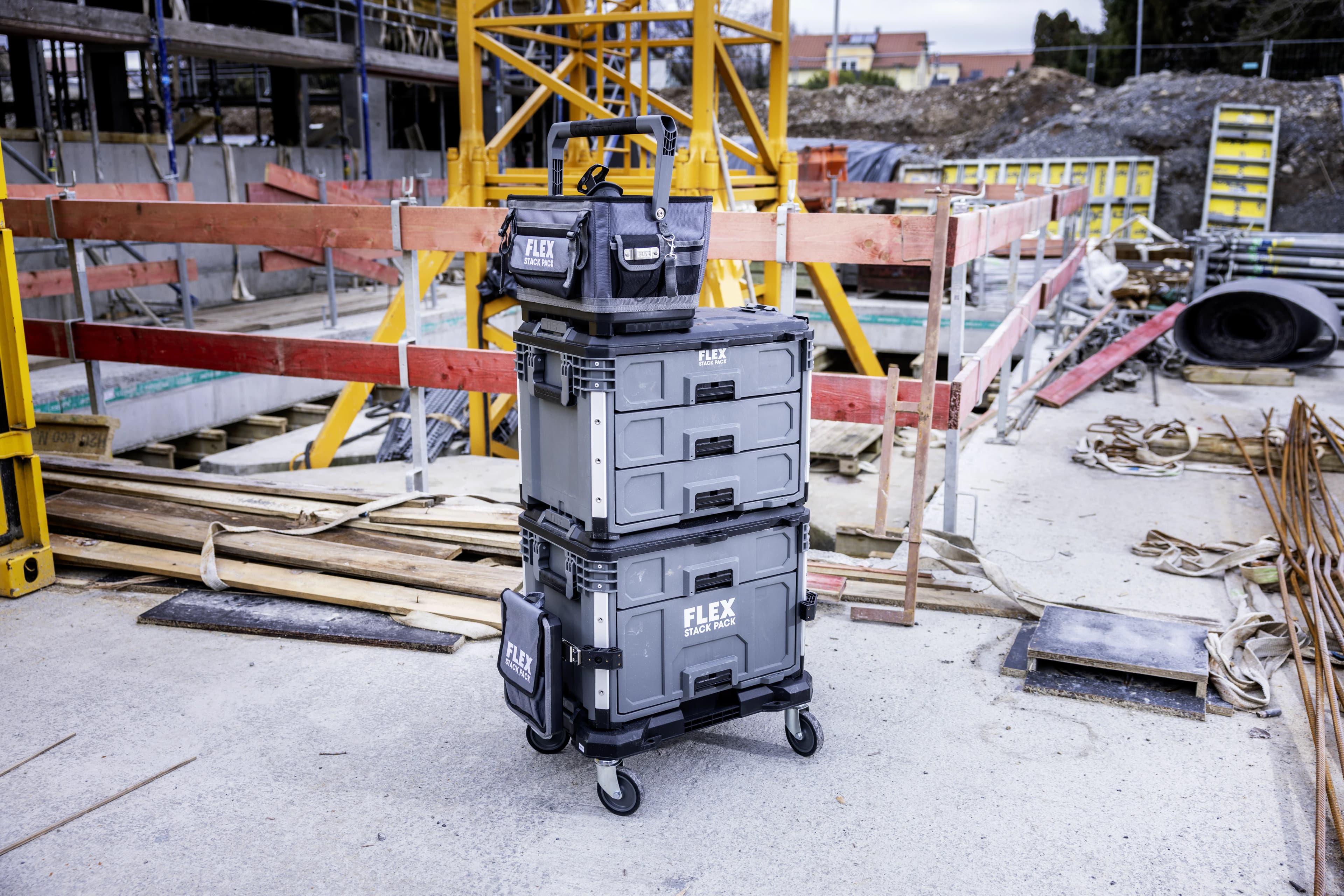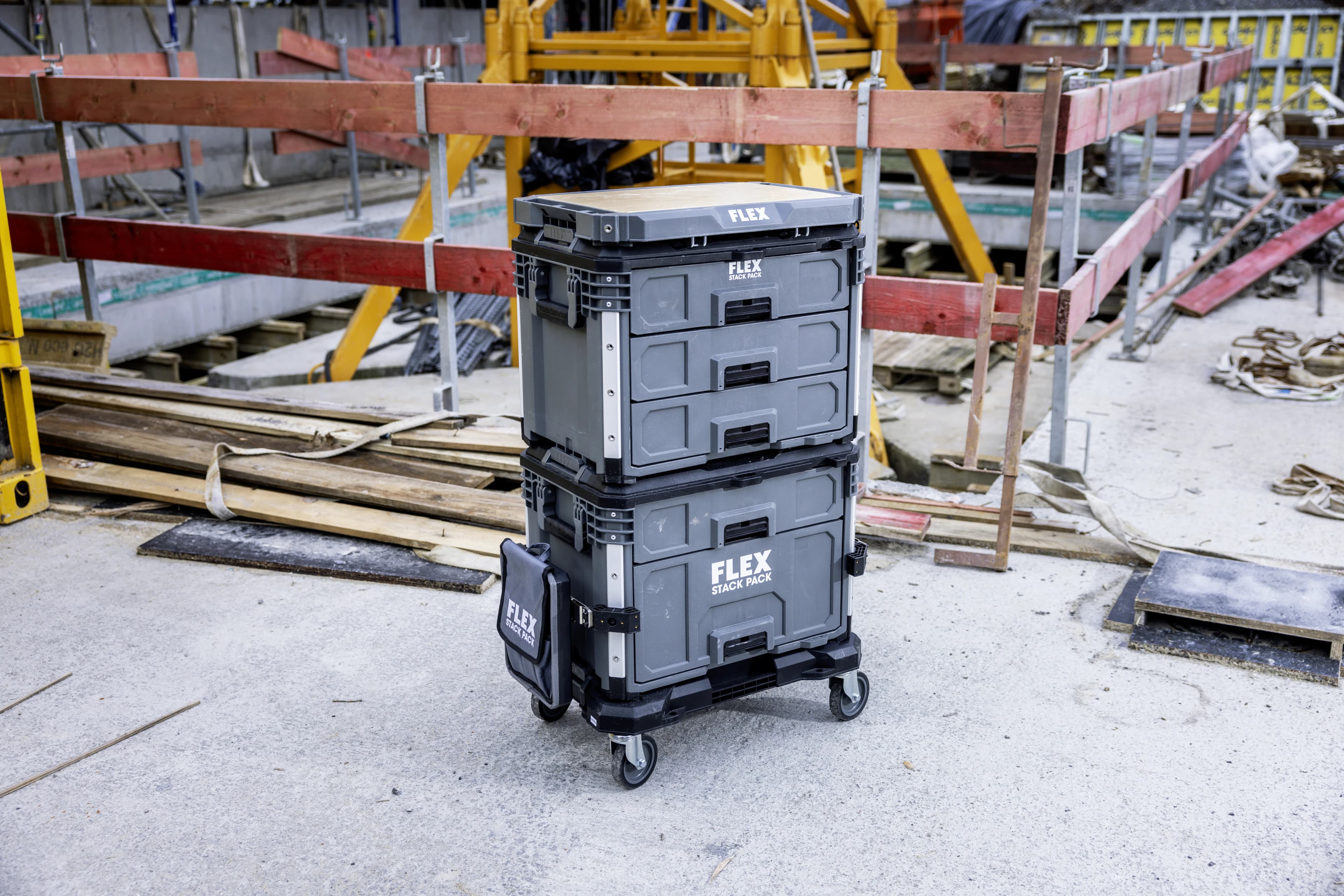 Tools and accessories can be easily transported to the construction site with the robust STACK PACK storage and transport system. The boxes are made of impact-resistant plastic with aluminium-reinforced corners, protecting tools and accessories from the toughest construction site conditions. The boxes have a durable metal latch, with additional handles ensuring flexible and comfortable handling. Interlocking quick-connect fasteners allow fast, flexible and effortless connection of the individual boxes so that the storage system can be assembled according to the user’s specific needs. The set consists of a worktop, two drawer boxes, one with 3 drawers and one with 2 drawers, and the trolley. Ideal for storing accessories and small parts. The contents are always perfectly organised and ready to hand.