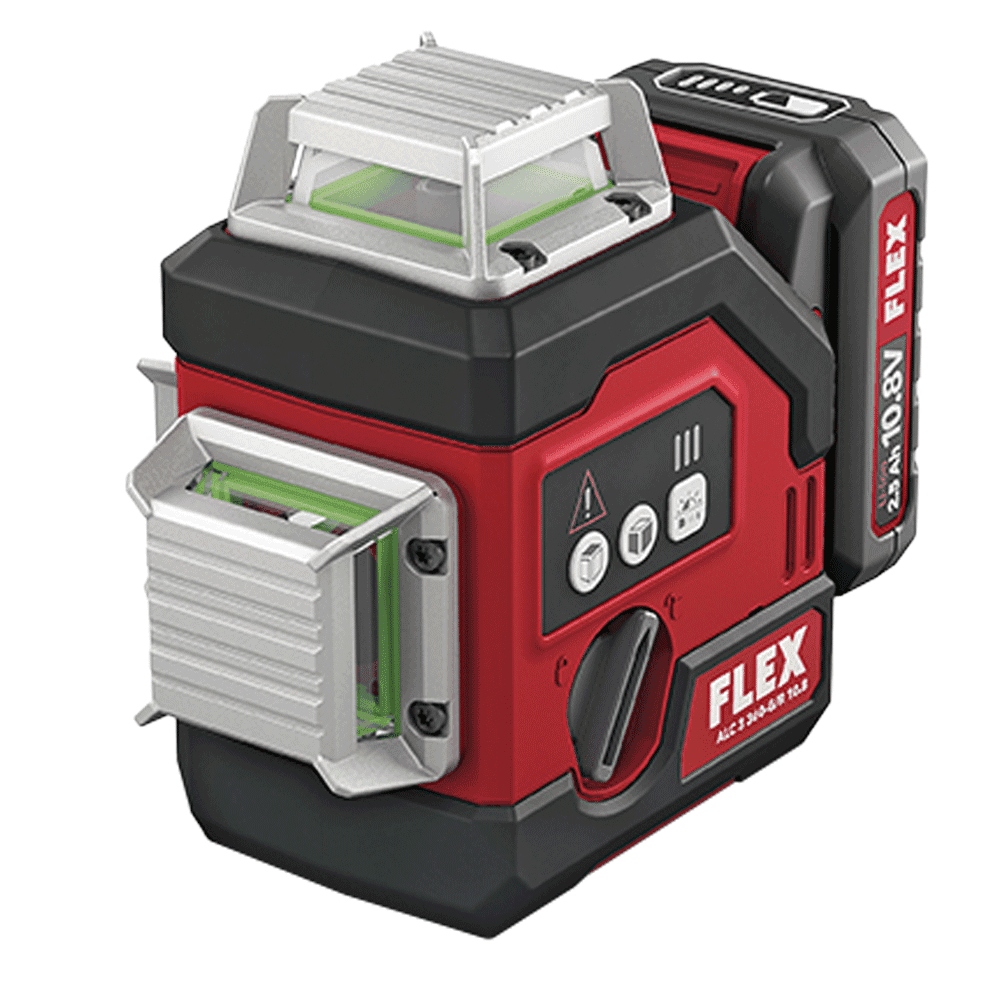 Despite all the similarities, the lasers do have decisive differences. The ALC 2/1 G/R creates a cross of a vertical line and a horizontal line, and is suitable for example for aligning tiled backsplashes, profiles, piping or wall painting. The ALC 3/1 additionally generates a lateral vertical line as well as plumb points on the ceiling and floor. "This makes it also suitable for aligning walls that are at right angles to each other for example," explains Oliver Gnann-Geiger, Head of Marketing at FLEX. The 3x360 G/R 10.8 can do even more: Thanks to its 360-degree radius, this creates circumferential cross lines in the entire room as well as on the ceiling and floor. This means that the device can be used, for example, to divide up space in a building that is still empty. The circumferential laser line also allows perfect positioning of ceilings, wall profiles and floor profiles. Depending on the brightness and the room size, the luminosity of the laser can also be adjusted across three stages.