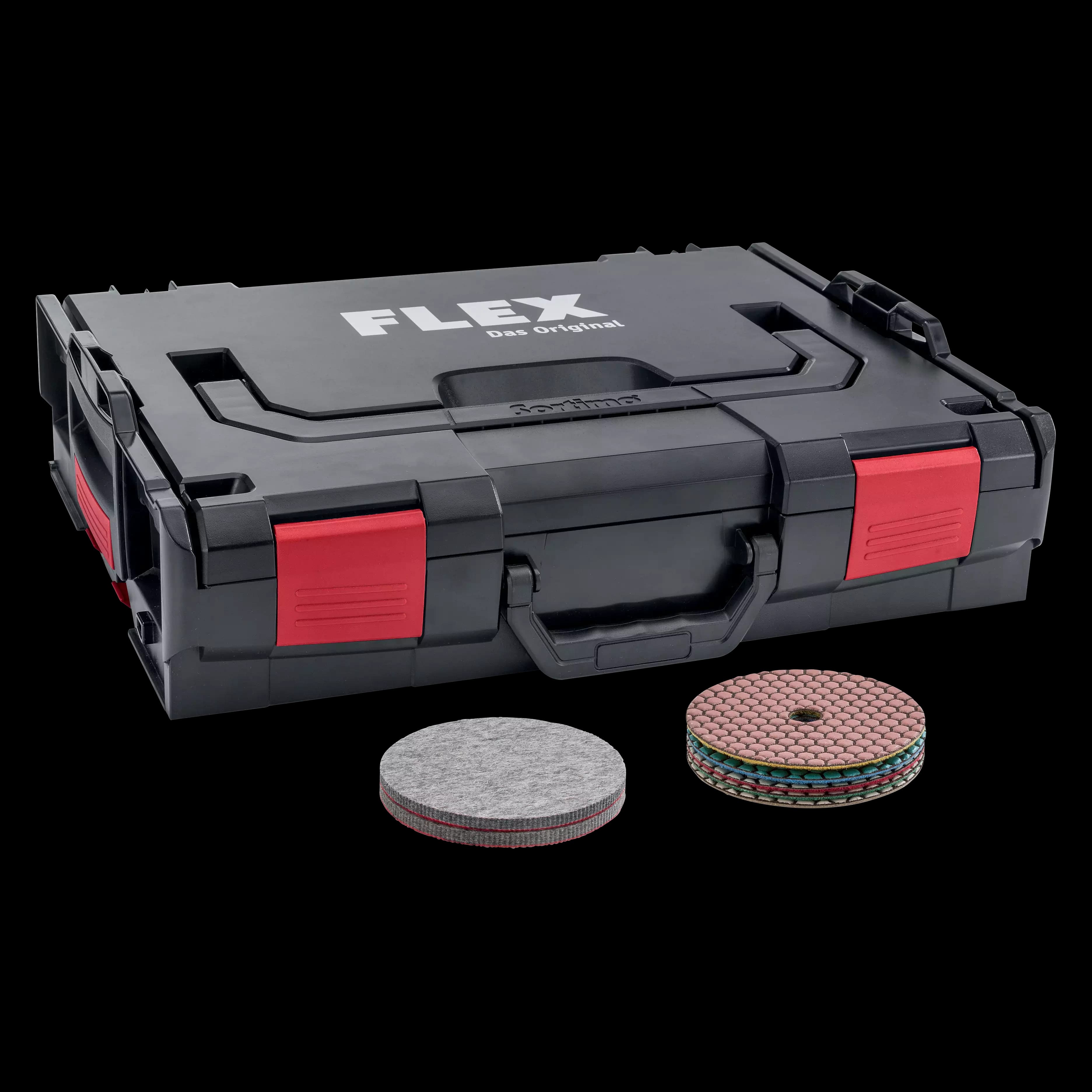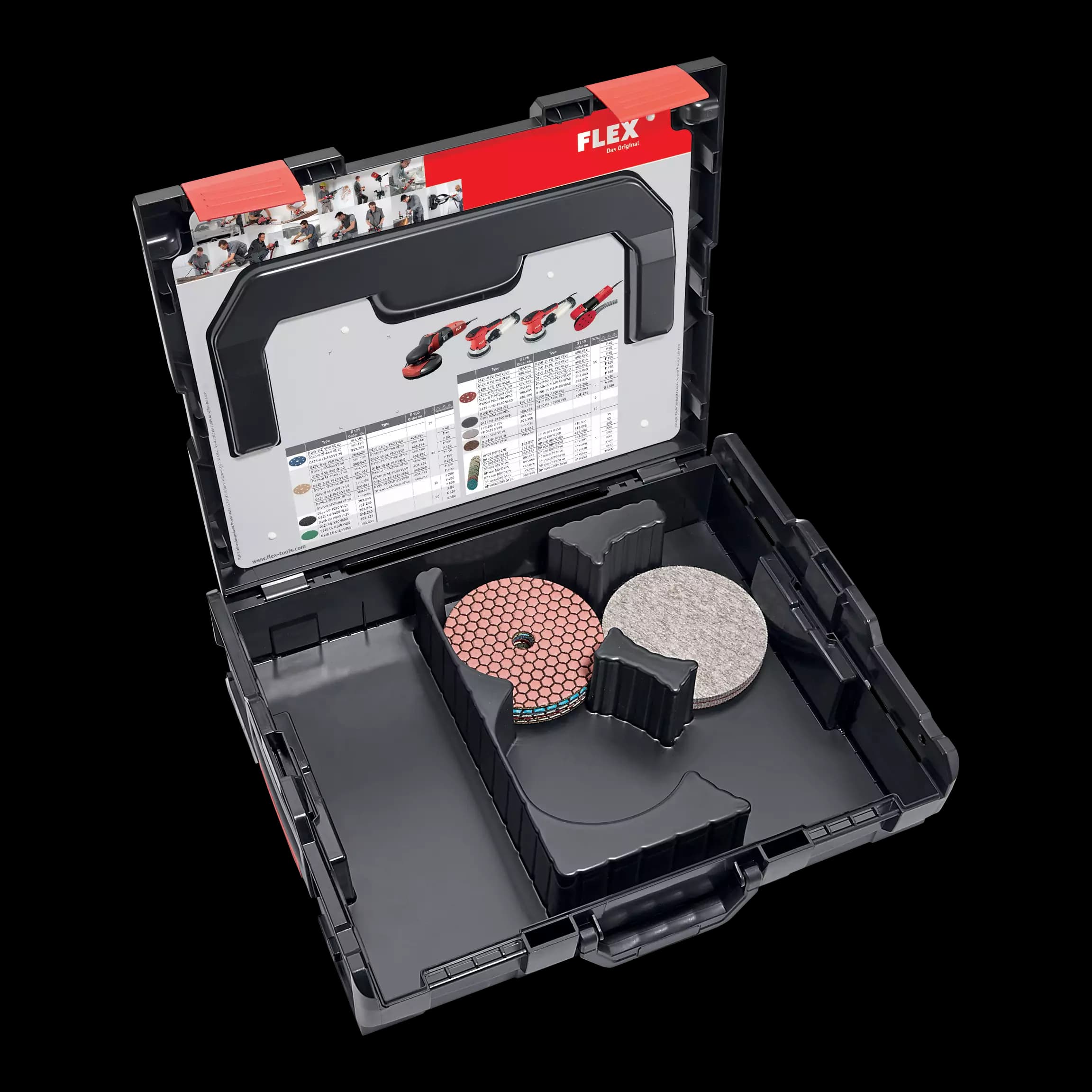 Setti kivipintojen käsittelyyn SUPRAFLEXillä. Sisältää 1 kantolaukun L-BOXX® 102, 1 tarvikelaukku TKE 4xD130/1x135x295, 1 timanttihiomakiekko, karkeudet 50, 100, 400, 800, 3000, 1 kova hioma-alusta, 1 pehmeä hioma-alusta.