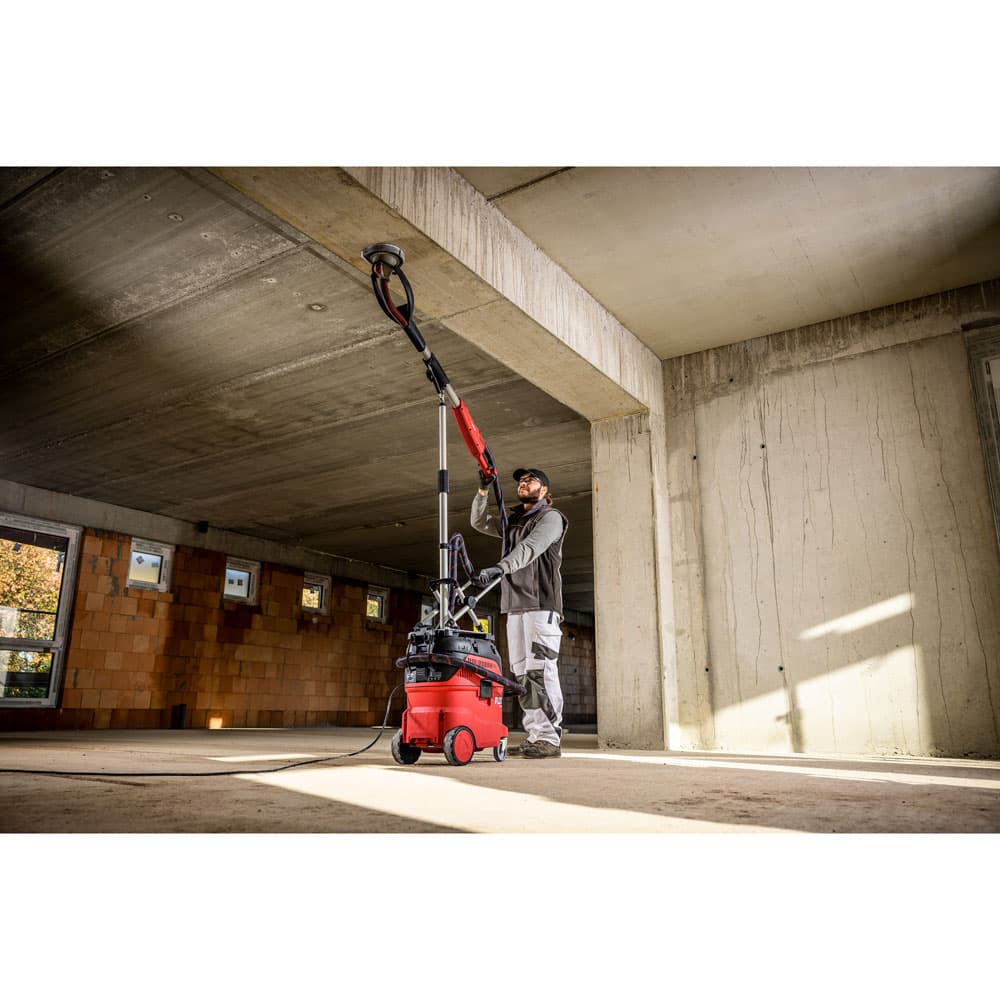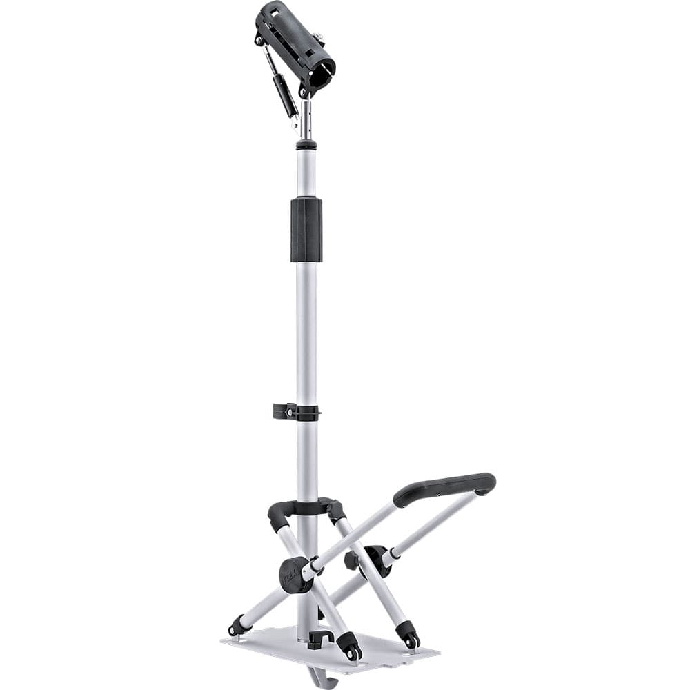 L’utilisation du poste de travail mobile pour Giraffe GM 270 commence par un transport aisé vers le lieu d’intervention. La rehausse pliable peut être montée sans outil, facilement et rapidement sur les aspirateurs FLEX des classes 33 et 44. Par la suite, la poignée extensible à deux niveaux du support et la tige de levier réglable sans clé peuvent être placées exactement à la hauteur de travail requise, avant que la Giraffe ne soit fixée en toute sécurité dans le porte-outil, sans opération de montage. Pendant l’utilisation, un ressort à gaz flexible situé sur la tête du support assure une manipulation optimale.