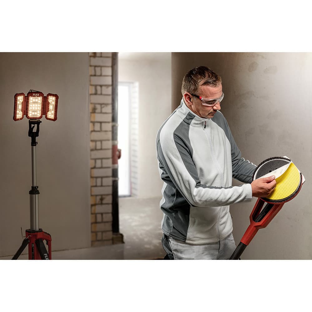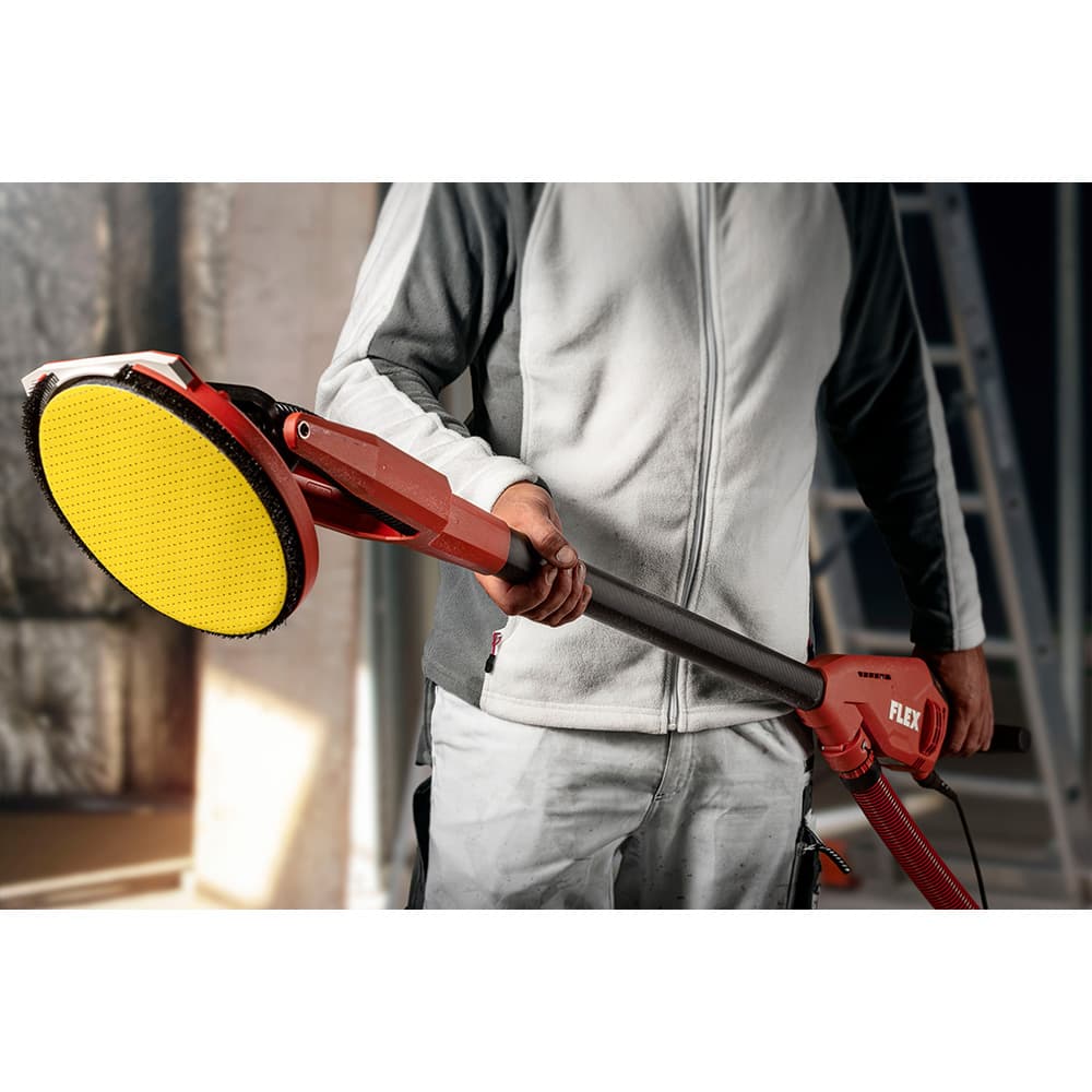 De FLEX ingenieurs hebben de volledige schuurkopstructuur helemaal opnieuw onder handen genomen. Hiervoor hebben ze de steunschijf volledig opnieuw ontworpen: met het oog op de centrale plaatsing van de schuurpads werd de klittenbandschijf, die in een centreerring is gemonteerd, van centreerhulpstukken voorzien. Een hierop geplaatste schuimrubberen interfacepad verhindert trillingen en vibraties en garandeert zo een optimaal schuureffect. Op deze manier vermijden we niet alleen onregelmatigheden die anders op de muur zouden terechtkomen, maar voorkomen we ook trillingen in de armen en schouders van de gebruiker. Samen zorgen deze nieuw ontworpen elementen van de schuurkop voor een schoner werkresultaat en bieden ze een verbeterde ergonomie en geoptimaliseerde bediening.