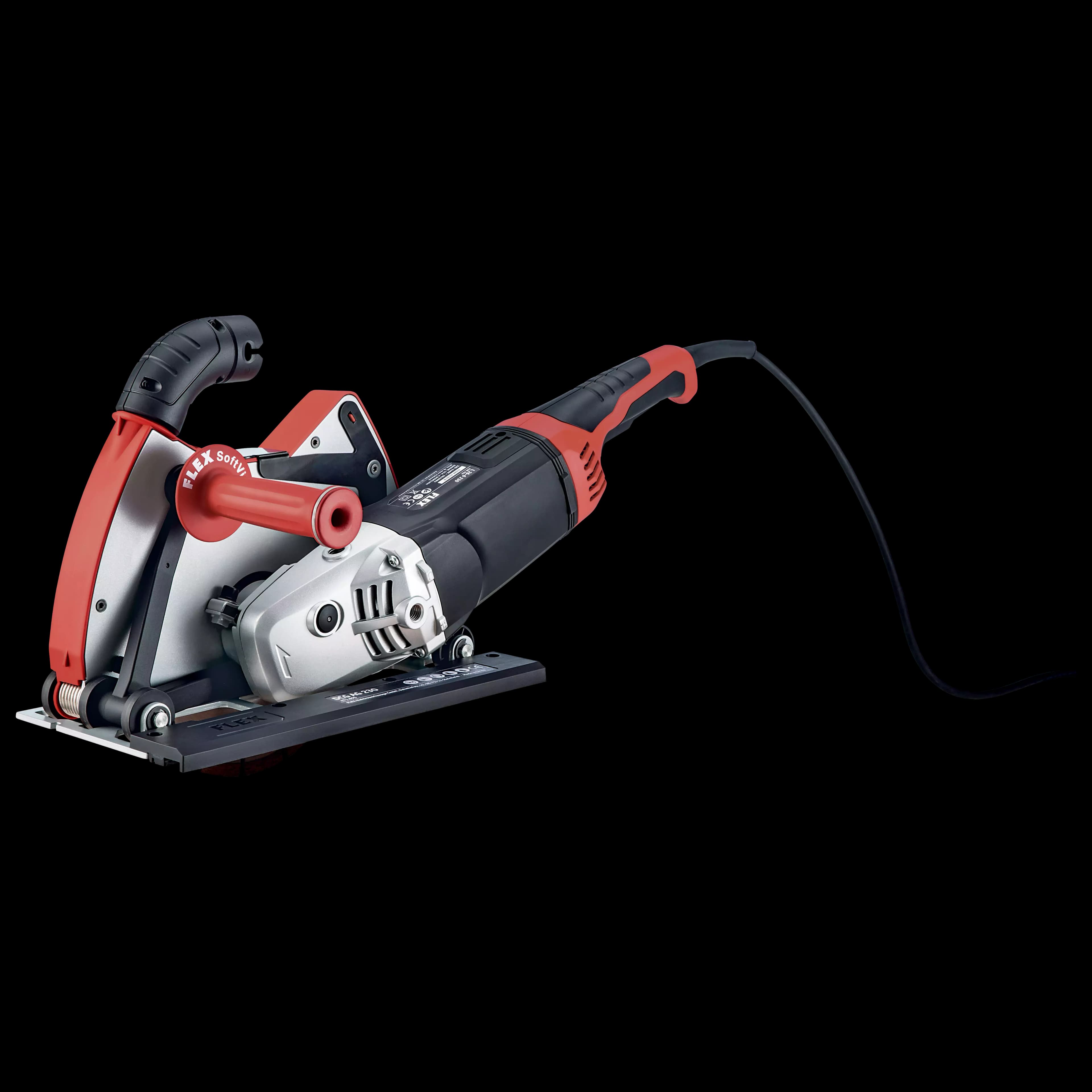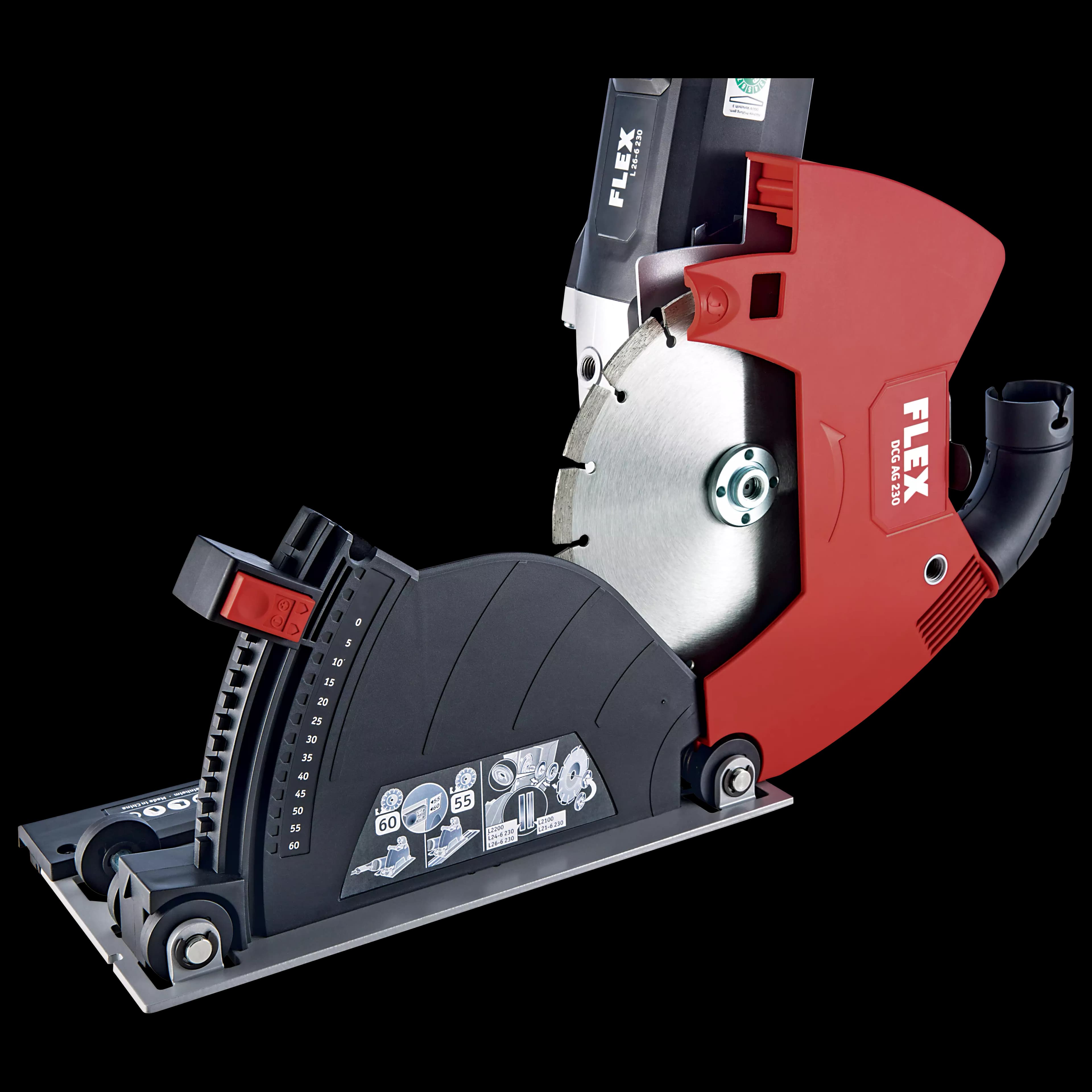 Osłona odpylająca z wydajnym odsysaniem pyłu zapewnia dokładne cięcie podczas pracy z diamentowymi tarczami tnącymi w połączeniu ze szlifierkami kątowymi 230 mm. Niezwykle stabilny, nie przekręca się dzięki bocznemu ciężarkowi szlifierki kątowej, jako elementowi stabilizującemu. Podstawa z kółkami ułatwia posuw, boczny uchwyt można zamontować z lewej lub prawej strony. Z przyłączem ssącym do systemu zatrzaskowego FLEX i adapterem do szyny prowadzącej. Ogranicznik głębokości ze skalą do ustawiania głębokości cięcia do użytku z szyną prowadzącą lub bez. Maksymalna głębokość cięcia 60 mm.